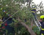 Baum auf Gartenhütte gestürzt.