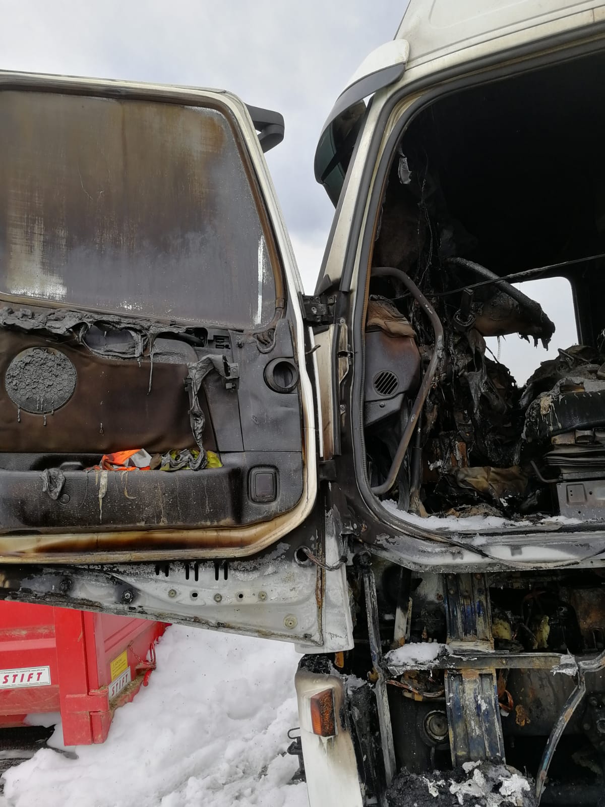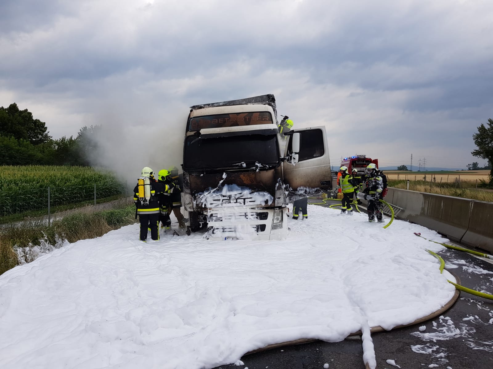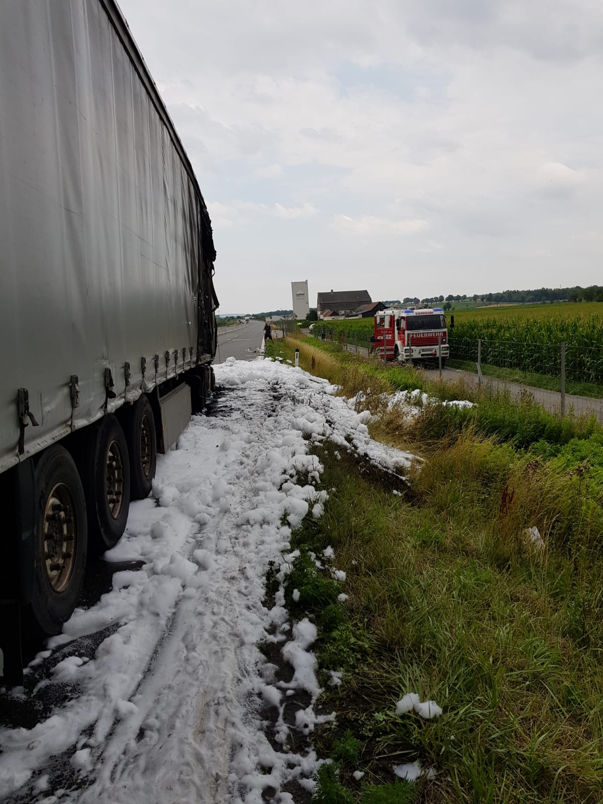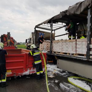 Bei der Ankunft stellte sich heraus, dass ein mit Papier (Drucksorten) beladener Sattelschlepper vermutlich nach einem technischem Defekt Feuer gefangen hatte. Die Zugmaschine und der vordere Teil des Aufliegers standen bereits in Vollbrand.