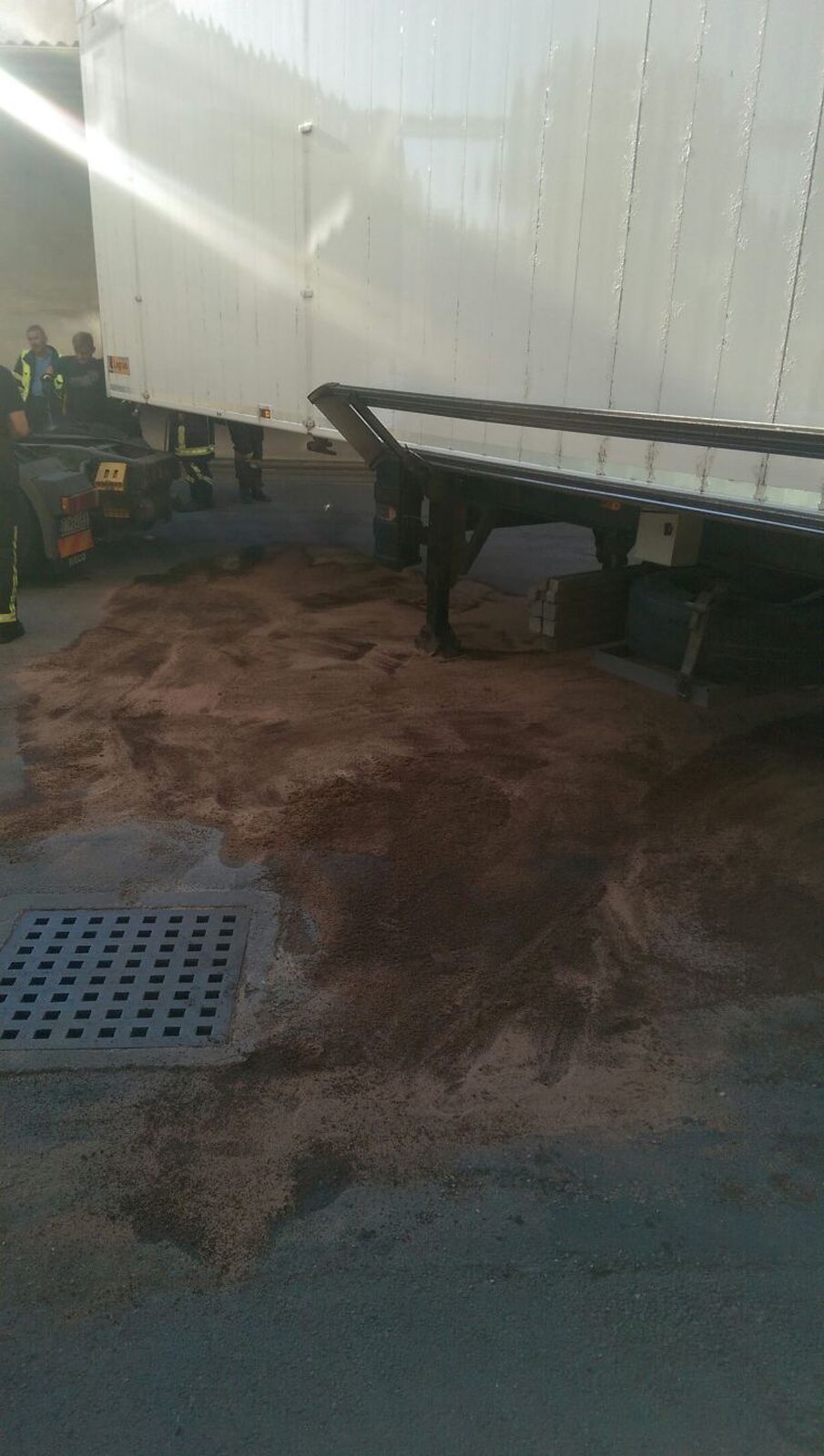 Bei Ladetätigkeiten am Gelände der Fa. Assmann ist bei einem LKW die Hydraulikleitung geplatzt. Das ausgelaufene Öl drohte in die Kanalisation zu laufen.