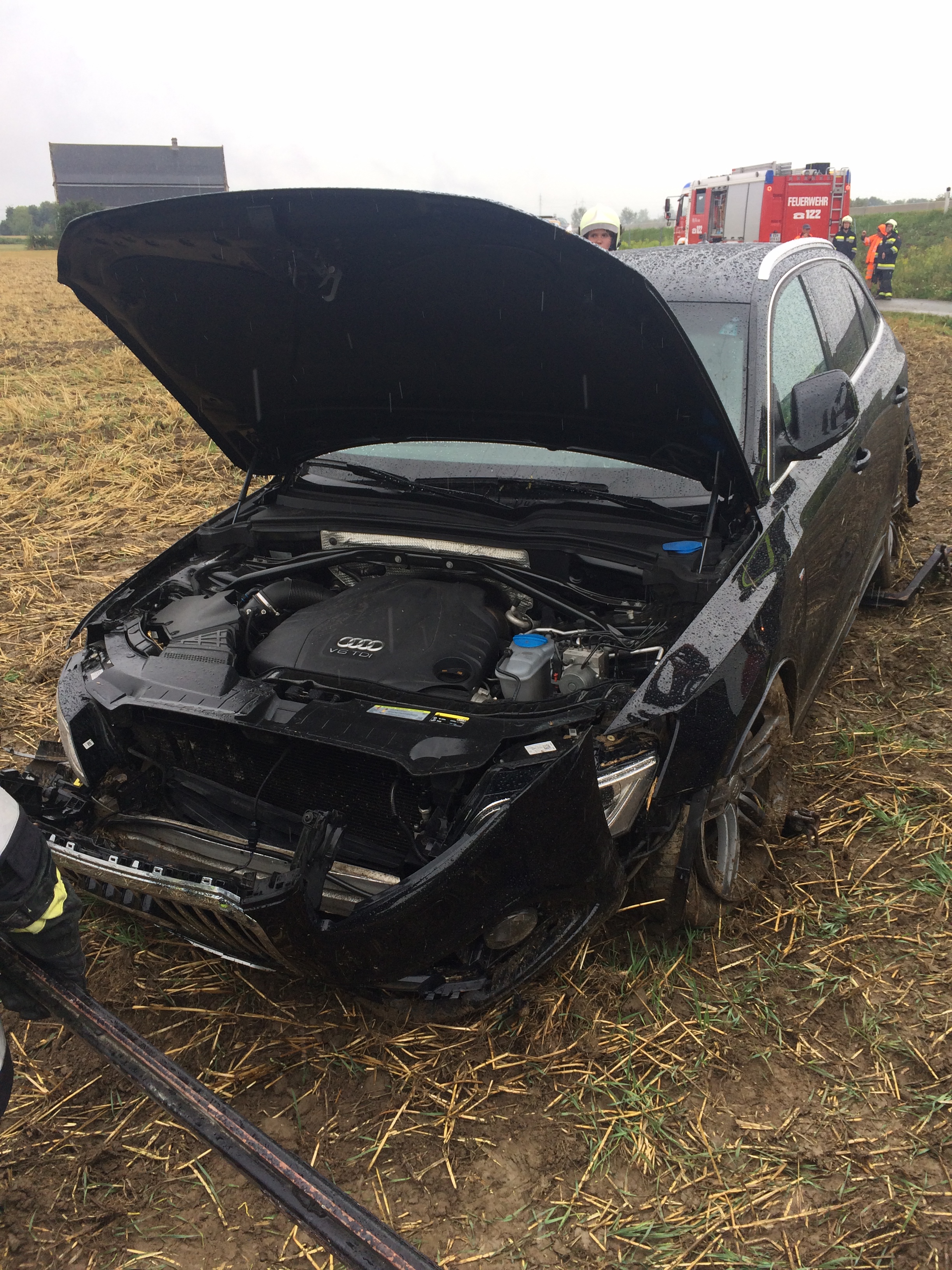 Ein in Richtung Hollabrunn fahrender PKW kam vermutlich aufgrund Aquaplanings von der Fahrbahn ab und landete im Acker. Bei dem Aufprall wurde das rechte Vorderrad ausgerissen.