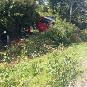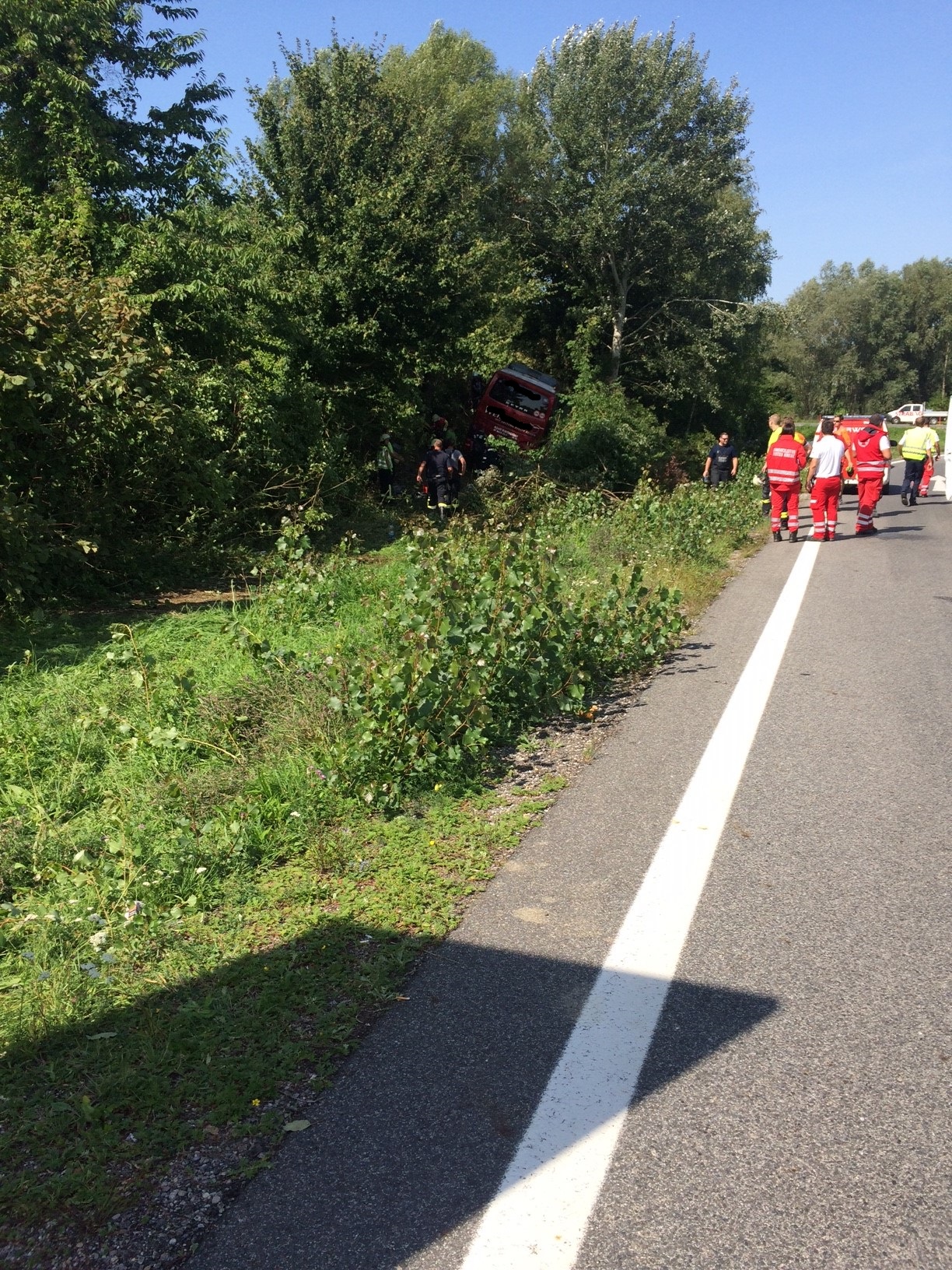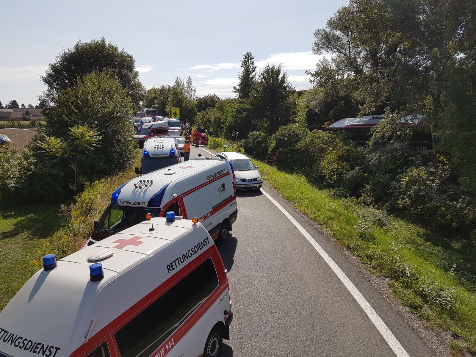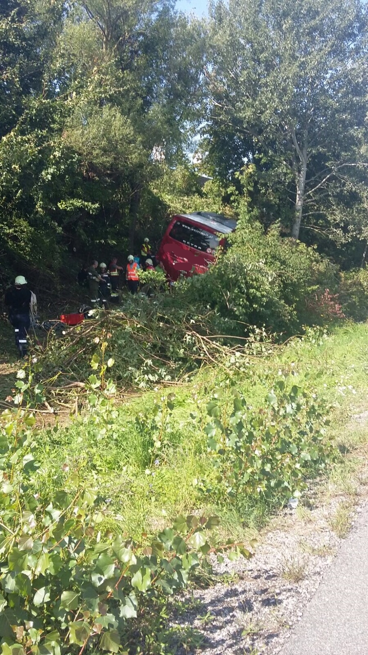 Vor Ort stellte sich folgende Lage dar: Ein Autobus mit 24 Insassen kam von der Fahrbahn ab und schlitterte in den Strassengraben, wo er von Sträuchern und kleineren Bäumen gebremst wurde. Zum Glück kippte der Bus nicht um sondern kam lediglich schräg zum Stillstand.