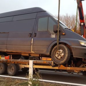 Ein Kastenwagen hatte eine Panne und sollte auf einen PKW-Anhänger verladen werden. Dabei rutschte der Wagen allerdings vorne vom Anhänger und blieb auf der Anhängerdeichsel hängen.