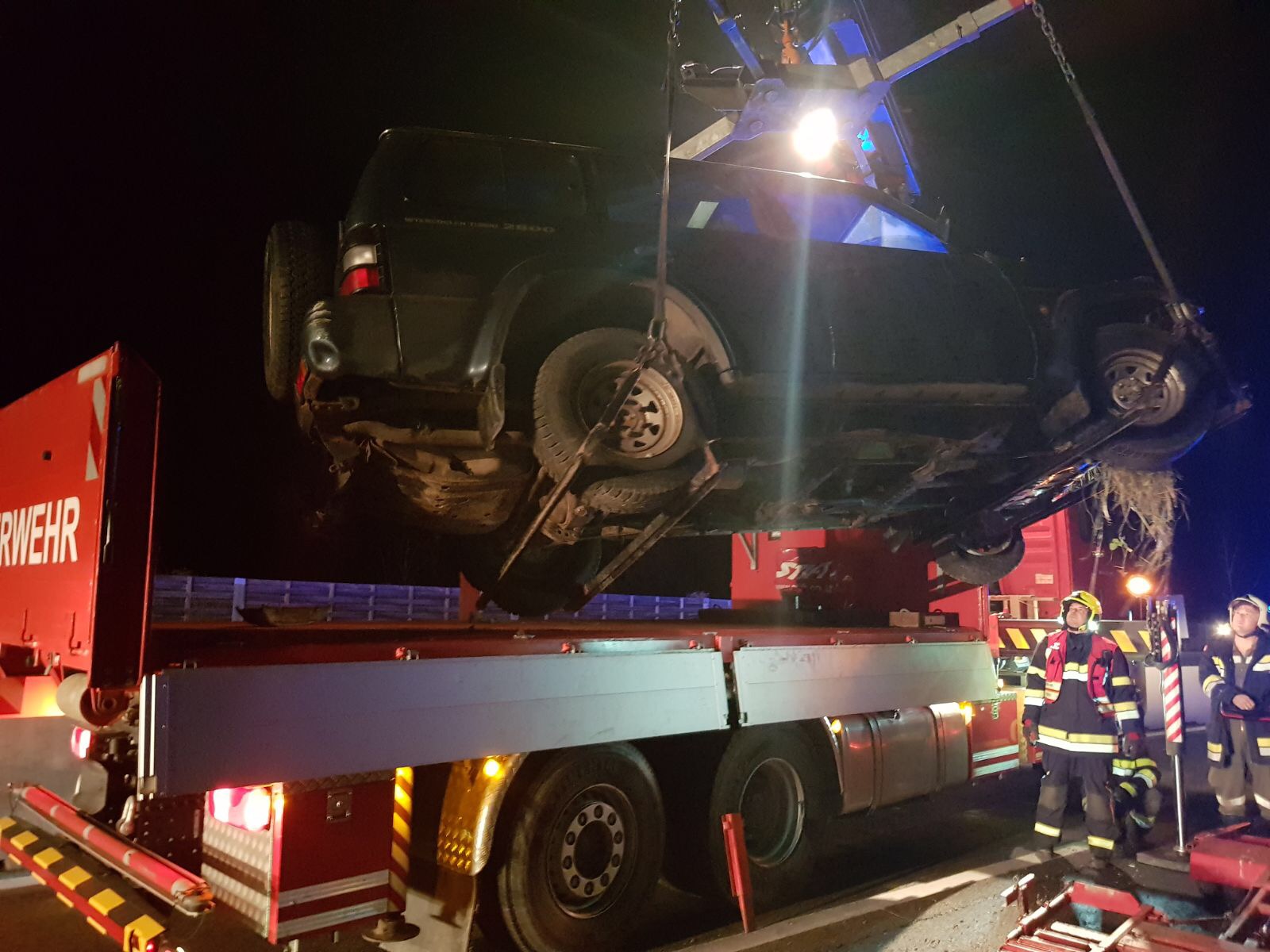 An der Einsatzstelle angekommen stellte sich folgende Situation dar: Ein Geländewagen, der auf einem Anhänger einen PKW transportierte, kam ins Schleudern und schlitterte in den Straßengraben. Dabei kippte der Anhänger um, die Verzurrösen rissen ab und der aufgeladene PKW überschlug sich in den Straßengraben. Verletzt wurde bei diesem Vorfall niemand.