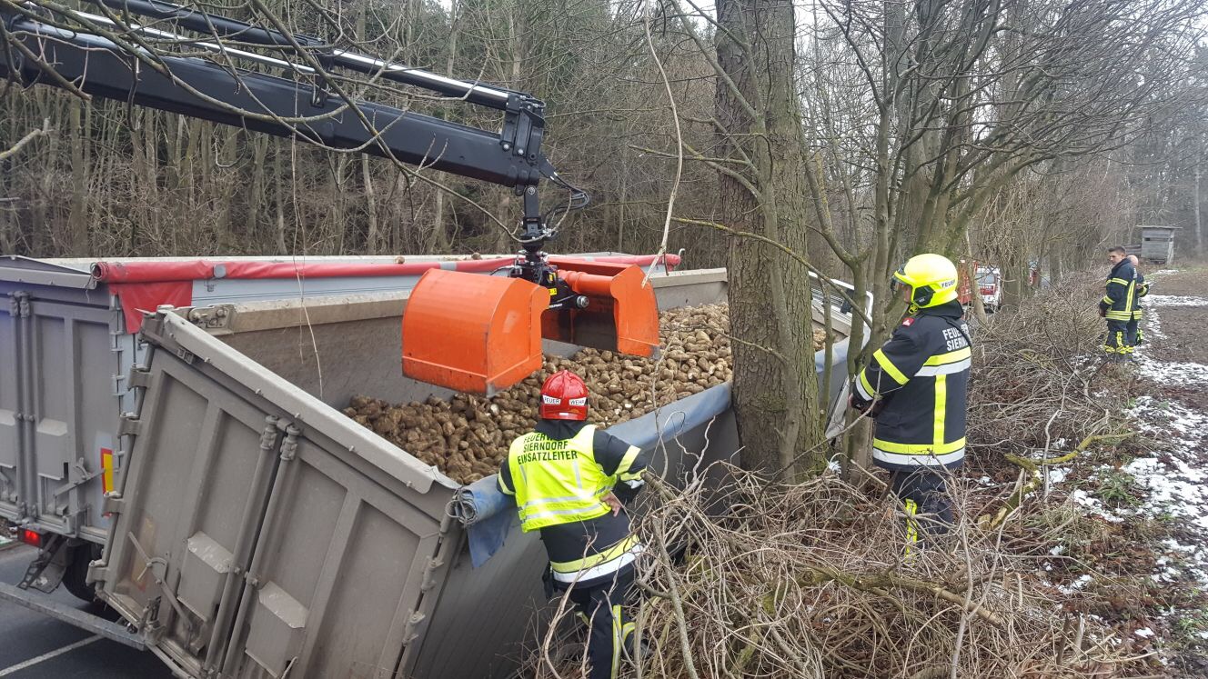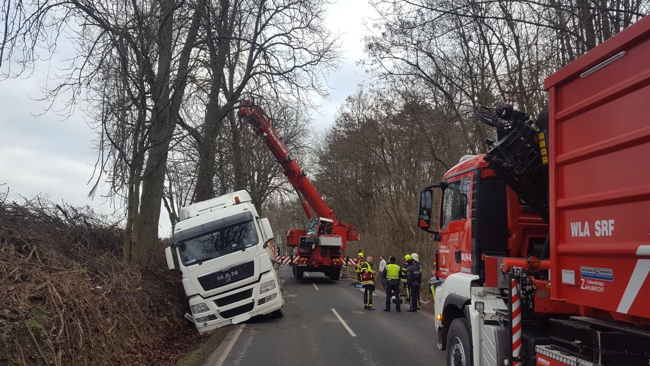 Ein mit Zuckerrüben beladener LKW-Sattelzug kam aufgrund eines Ausweichmanövers in den Straßengraben und drohte umzustürzen.