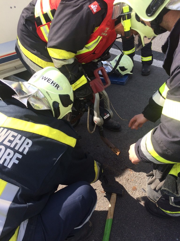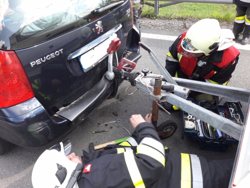 Der silberne PKW wurde mittels Abschleppplateau des WLFA-K abtransportiert, beim zweiten PKW mussten wir zuerst die Anhängekupplung demontieren um anschließend den Wohnwagen mit dem MTF von der S3 ziehen zu können. Das Wohnwagen-Zugfahrzeug konnte die Fahrt fortsetzen.
