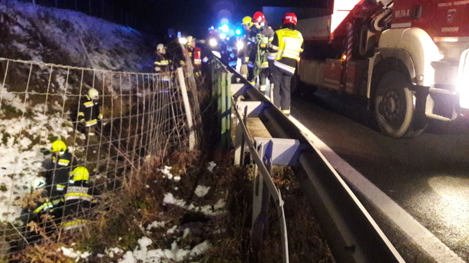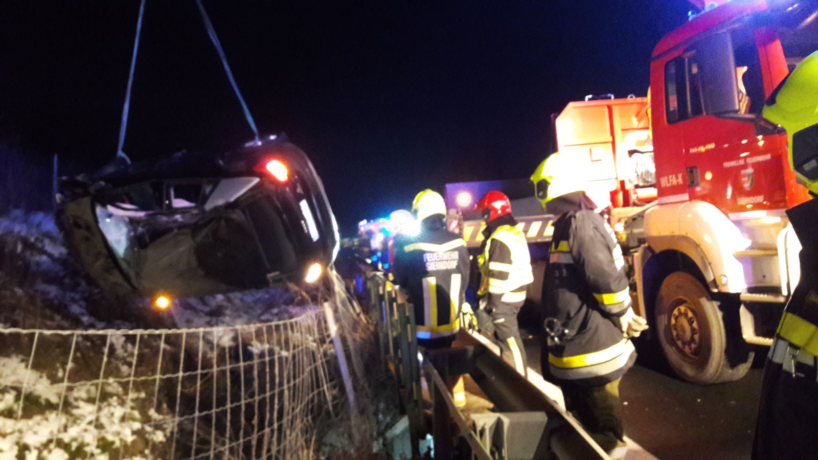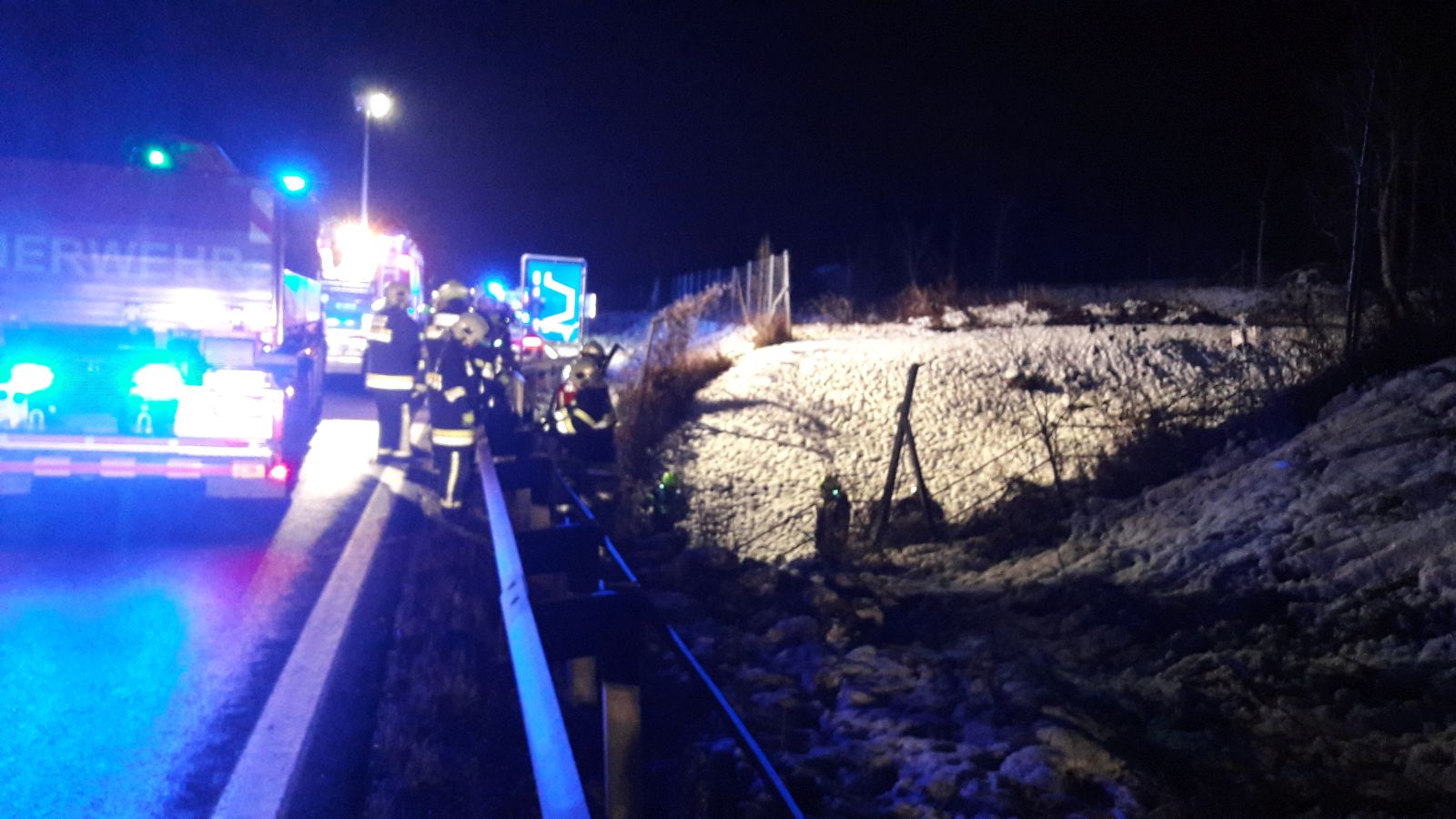 Ein PKW war aus ungeklärter Ursache von der Fahrbahn abgekommen, im Straßengraben der Leitschiene entlang geschlittert und schließlich auf dem unter der Fahrbahn querenden Weg seitlich liegend zum Stillstand gekommen.