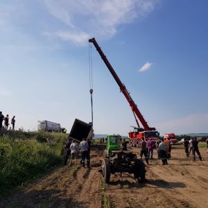 Am Zugfahrzeug wurde in der Zwischenzeit auch die Kardanwelle ausgebaut um das spätere Abschleppen zu ermöglichen. Nachdem der Anhänger leergeräumt war konnte das Kranfahrzeug der FF Hollabrunn in Stellung gebracht werden. Vor dem Anheben wurde noch der Anhänger innen mit Deckensteher stabilisiert. Dann wurde der LKW aufgerichtet und gleichzeitig mit der Seilwinde unseres RLFA-2000 von der Böschung gezogen.