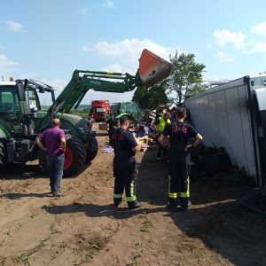 Ein voll mit Äpfel beladener Sattelschlepper war aus unbekannter Ursache über den Fahrbahnrand hinaus gekommen, über die Böschung gestürzt und schließlich im angrenzenden Feld seitlich zum Liegen gekommen.