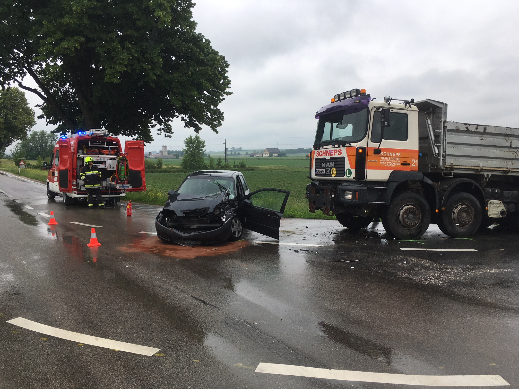 Nach Freigabe der Unfallstelle durch die Polizei wurde der PKW mittels WLFA-K zum Bauhof Sierndorf abtransportiert. Der LKW konnte trotz leichtem Schaden weiterfahren.