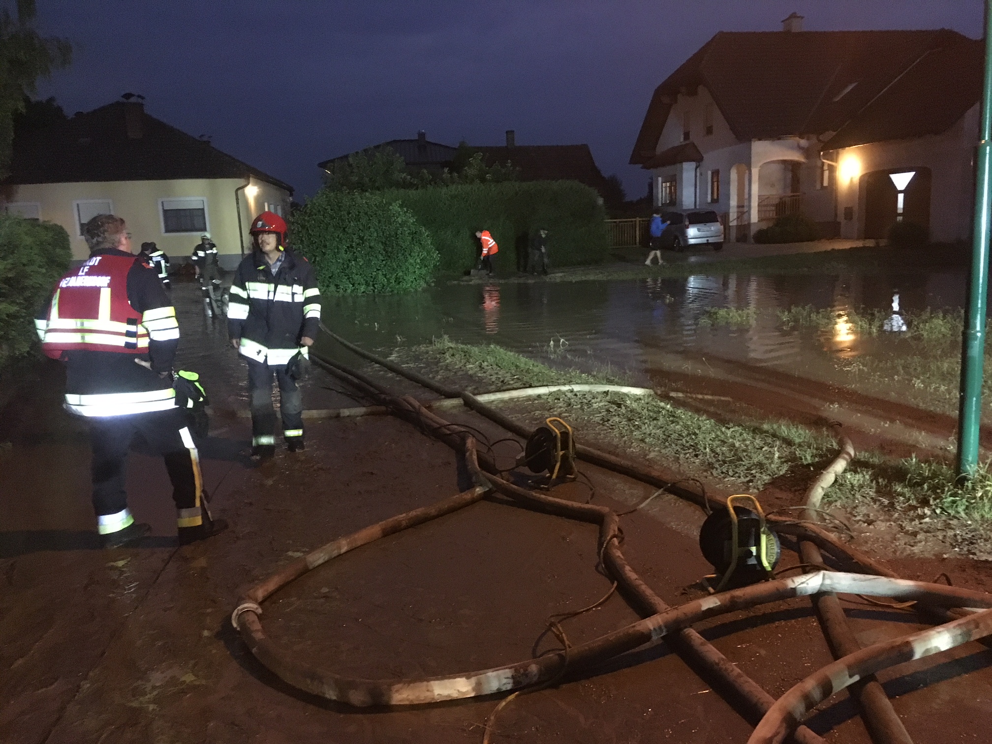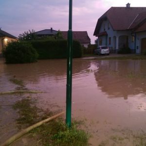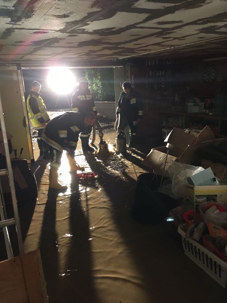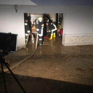 Von der Einsatzleitung bekamen wir den Auftrag mit der FF Hausleiten den Keller eines Einfamilienhauses leer zu pumpen, sowie das Waser auf einem überfluteten Straßenzug in den Bach zu pumpen.