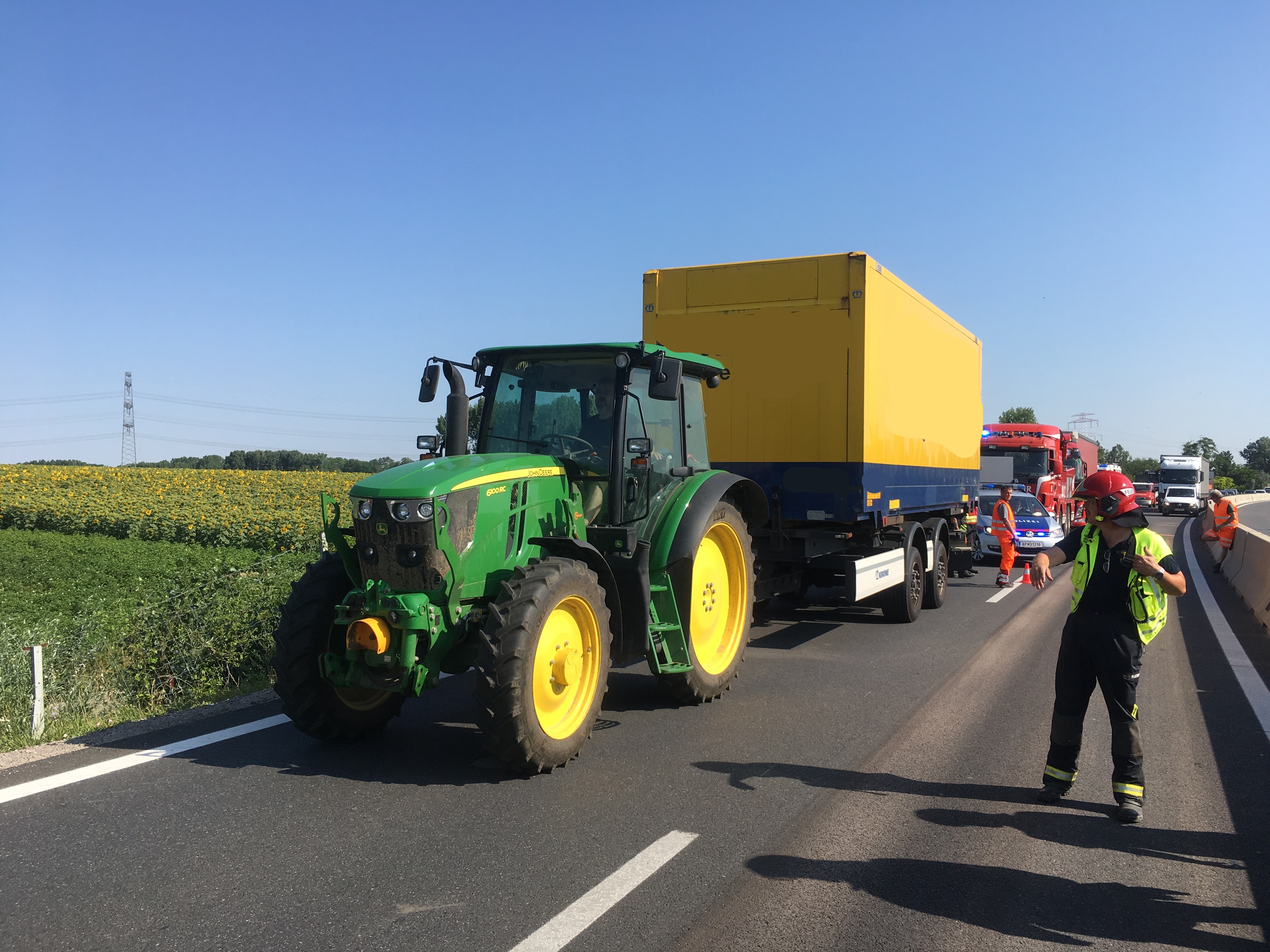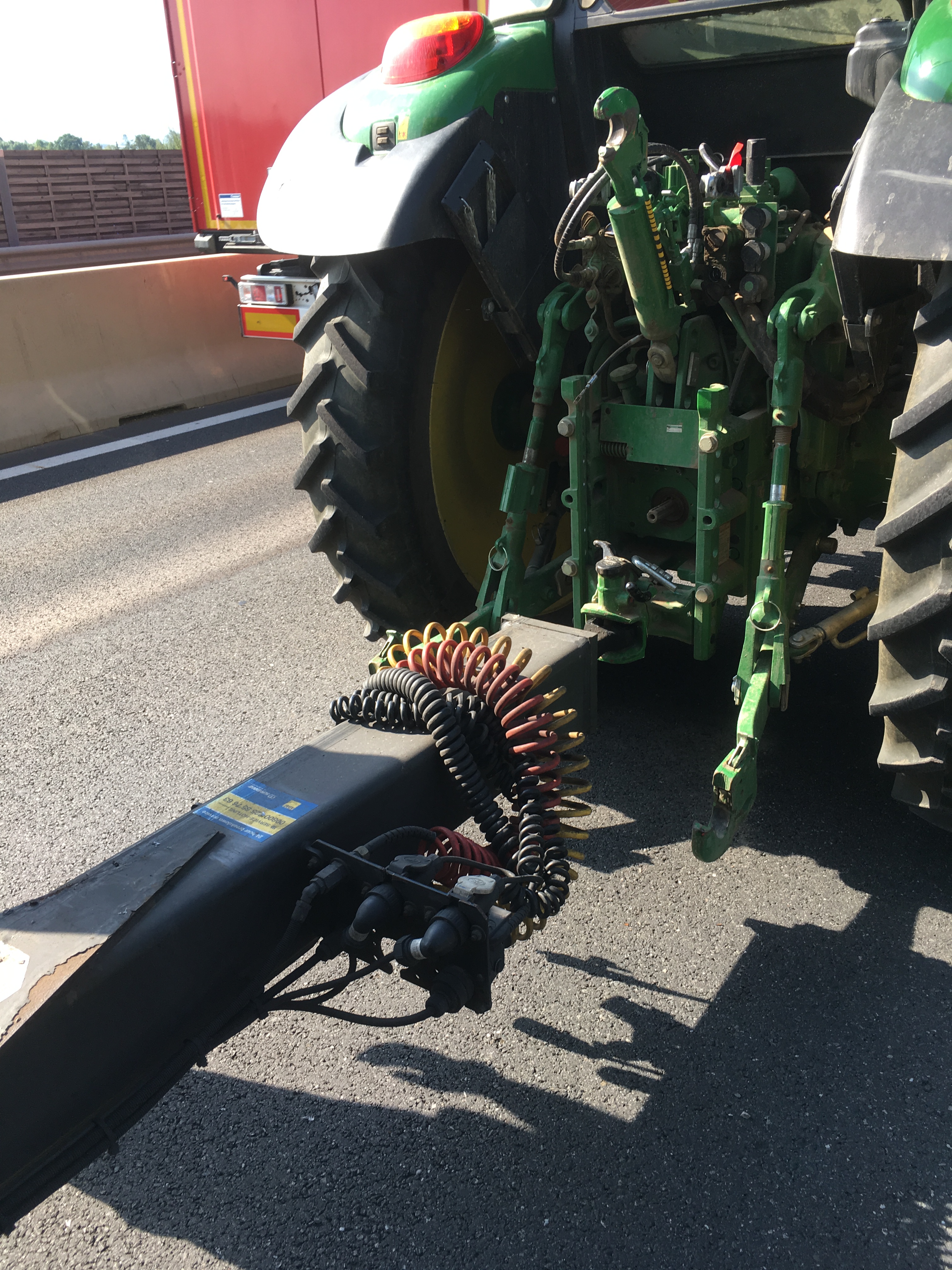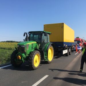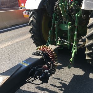 Beim mittleren LKW wurde die Deichsel des Anhängers des Motorwagens geschoben und beschädigte die Anhängekupplung sowie die Luftversorgung für die Luftfederung. Nach Absichern des Anhängers und Lösen des Verriegelungsbolzens der Anhängekupplung konnte das Gespann durch Vorwärtsfahren der Zugmaschine getrennt werden. Da die Deichsel dieses Anhängertypes zu niedrig für die Anhängerkupplungen unserer Feuerwehrfahrzeuge ist, wurde kurzerhand ein Kamerad der FF Sierndorf mit seinem Traktor für den Abtransport angefordert. Unter Absicherung durch ein Fahrzeug der Autobahnpolizei konnten Traktor+Anhänger sowie der leicht beschädigte, aber fahrbare Motorwagen bis zur nächsten Ausfahrt fahren und wurden dort abgestellt.