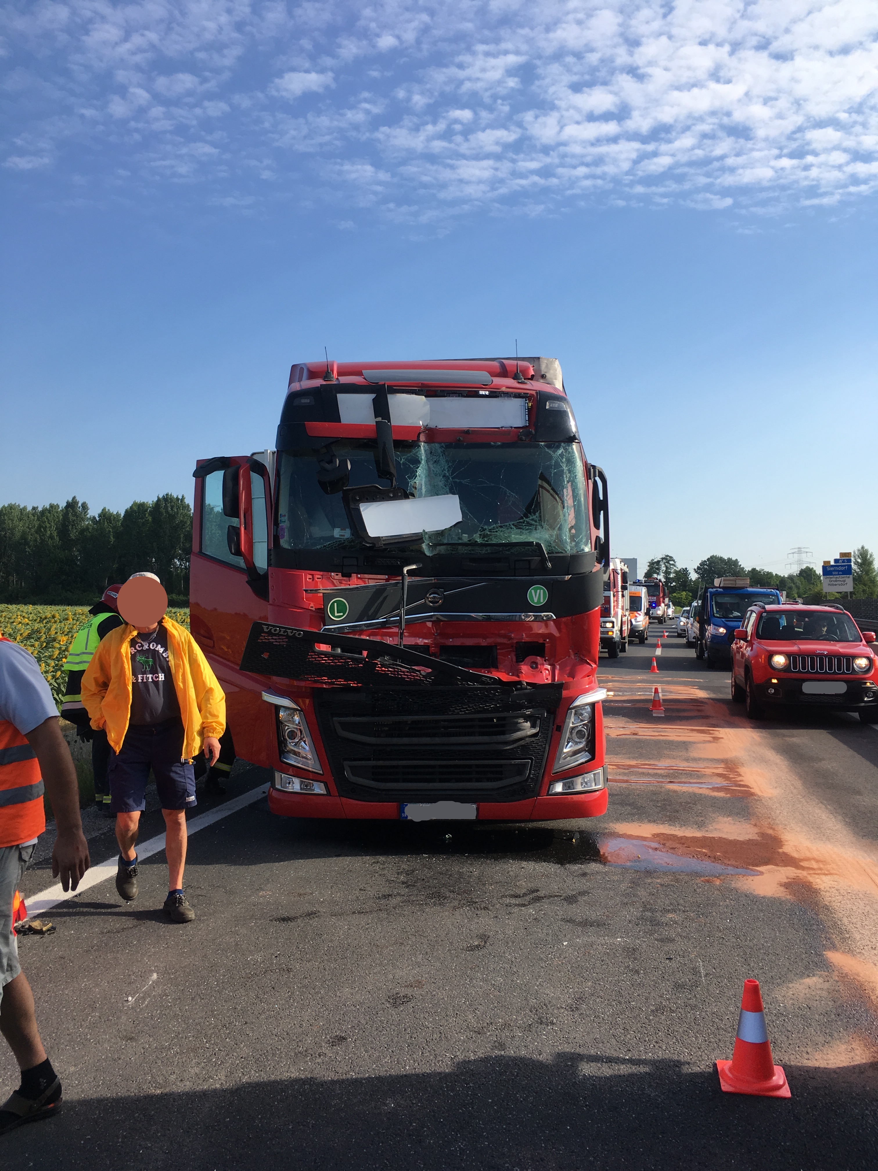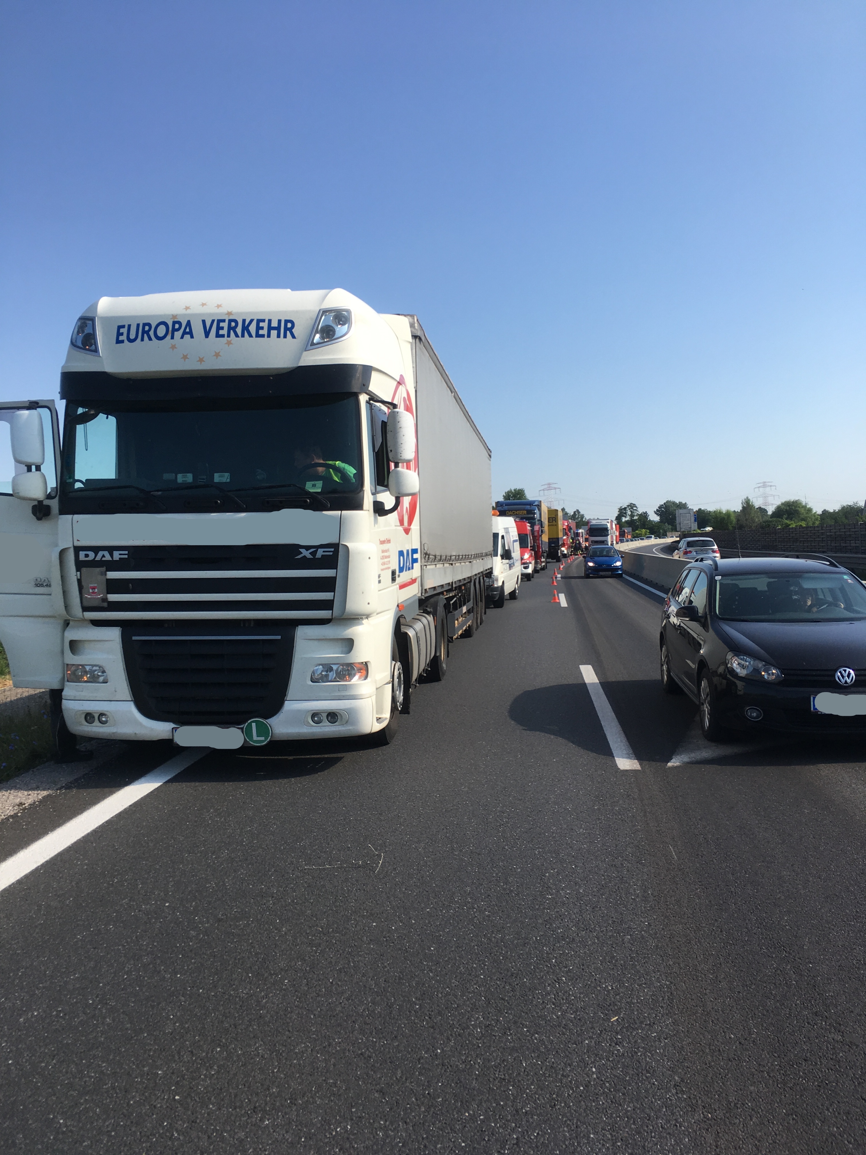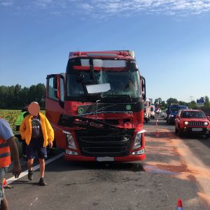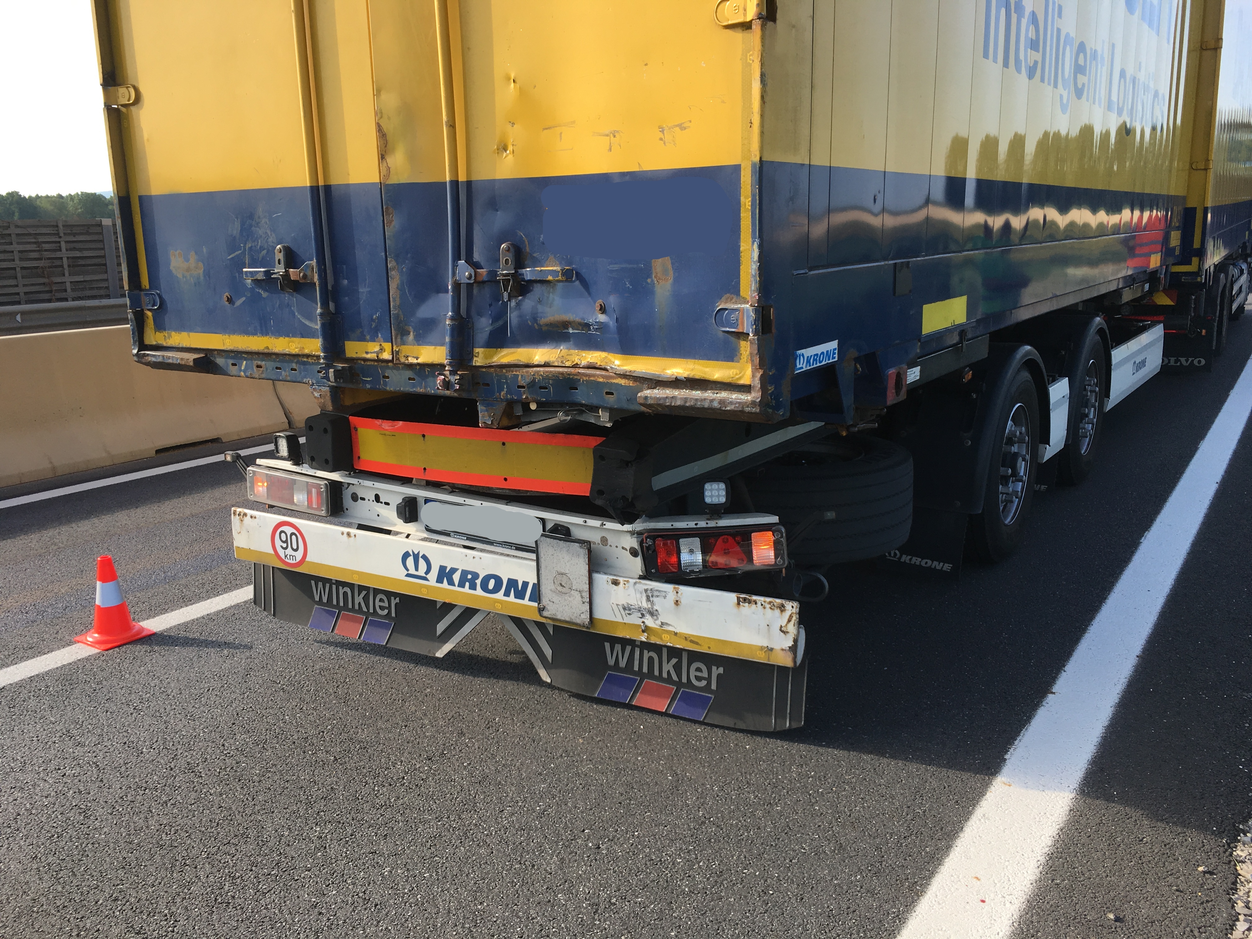 Ein Sattelschlepper musste aufgrund eines Defektes in der Spritversorgung auf der ersten Spur anhalten, der folgende LKW bremste und hielt an, der dritte LKW konnte nicht mehr rechtzeitig anhalten und krachte in das Heck. Zum Glück wurde dabei niemand verletzt.