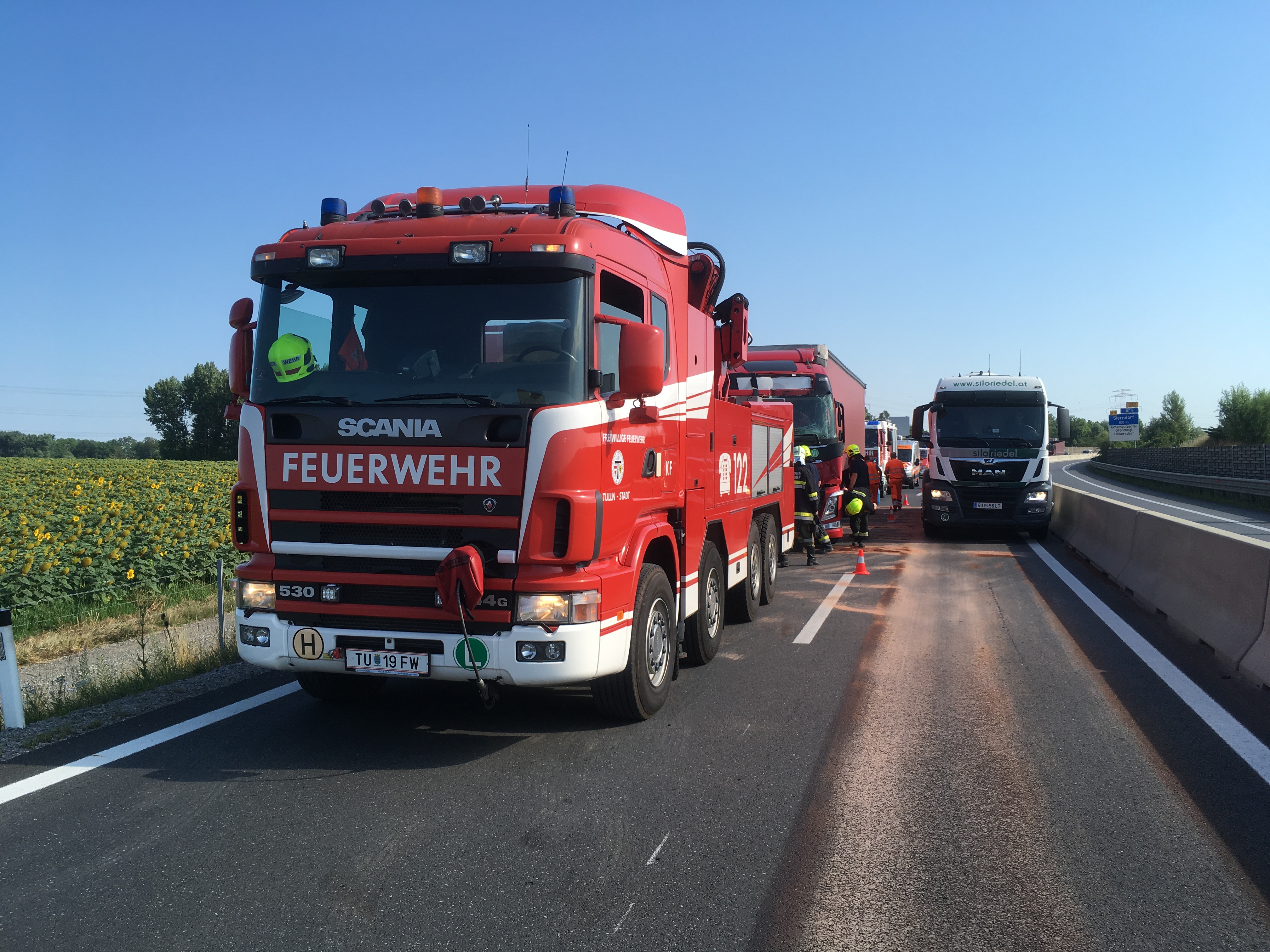 Beim hintersten LKW verschob sich durch den Aufprall die Ladung wobei einige der geladenen Kartons aufgerissen wurden und der Inhalt (Sirup) aus dem Auflieger auf die Fahrbahn tropften. Mit Ölbindemittel wurde die Flüssigkeit gebunden. Da bei der Zugmaschine die Lenksäule abgerissen war, wurde für den Abtransport die FF Tulln-Stadt mit dem Kranfahrzeug angefordert. Wir unterstützten die Kameraden der FF Tulln-Stadt bei der Demontage der Kardanwelle und diversen Karosserieteilen der Zugmaschine um die Verladung auf die Abschleppbrille zu ermöglichen. Der Sattelschlepper wurde anschließend von der Autobahn geschleppt und gesichert abgestellt.