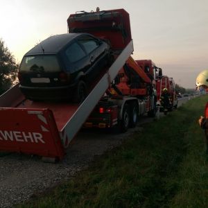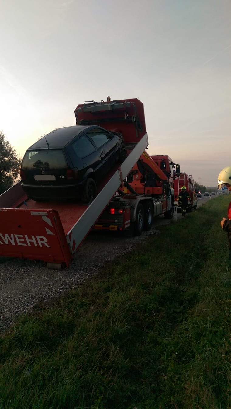 Zum Glück war der Fahrer unverletzt und nach Freigabe durch die Autobahnpolizei wurde der PKW mittels Kran auf die Räder gestellt, anschließend auf das Abschleppplateau verladen und abtransportiert.