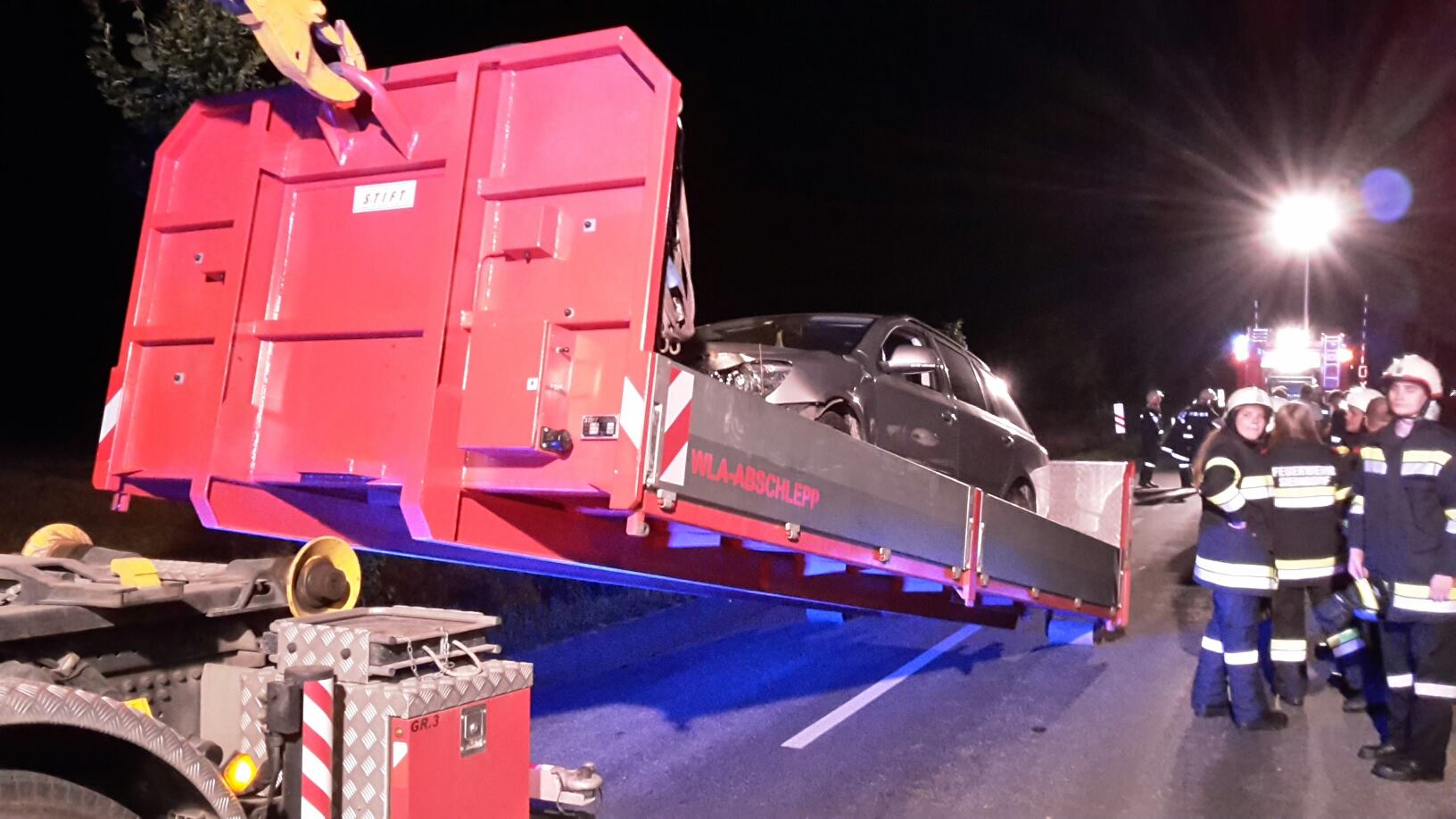 Das verunfallte Fahrzeug wurde mittels Seilwinde wieder auf die Straße gezogen und mit dem WLF-Kran abtransportiert.