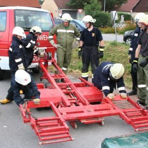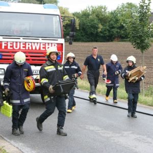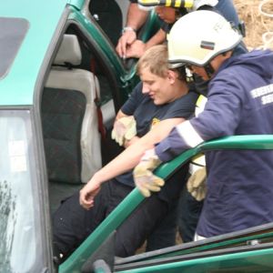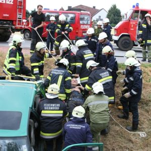 Nach einer Grillerei klang der Abend beim Lagerfeuer und bei gemütlichen Spielen aus, ehe endlich Nachtruhe einkehren konnte. Nach einem ausgiebigen Frühstück am Sonntag schrillte der Pager abermals Alarm: In der Bahnstraße kam es zu einem schweren Unfall, bei dem der Beifahrer im Fahrzeug eingeklemmt wurde und ein Passant unter dem Fahrzeug schwer verletzt aufzufinden war.
