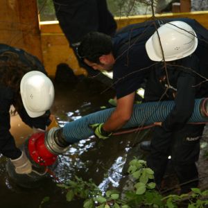 Sonntag vormittags musste dann noch ein Brand gelöscht werden. Herausforderung dabei war die Aufstauung des Göllersbaches. Auch der Wasserwerfer kam dabei zum Einsatz.
