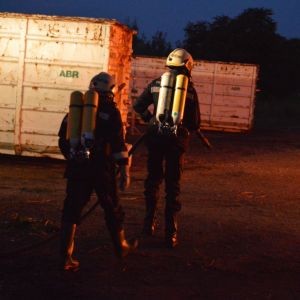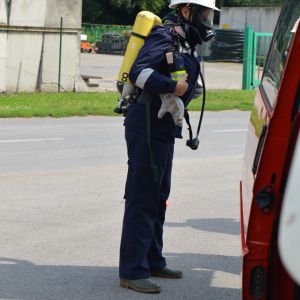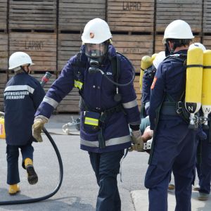 Als erstes war ein Schadstoffunfall nachgestellt. Eine verletzte Person musste gerettet werden und der undichte Behälter musste abgedichtet werden.