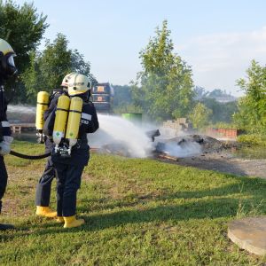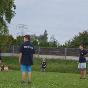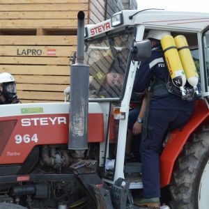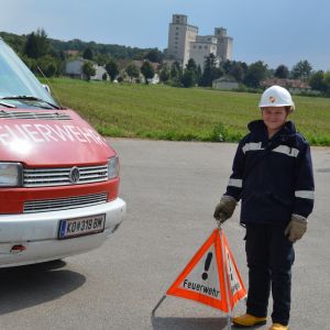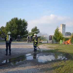 Später war die Übungsannahme der Brand eines kleinen Gebwerbebetriebes in Oberolberndorf, bei dem auch ein Dieseltank und ein Fass mit brennbarer Flüssigkeit betroffen waren. Dabei mussten die Mädchen und Buben den Brand löschen und die brennbare Flüssigkeit mit einem Schaumteppich bedecken.
