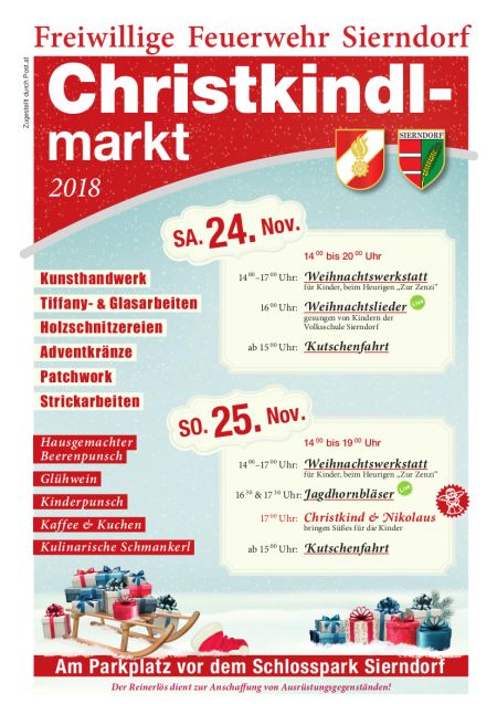 Am Samstag, den 24. November und Sonntag, den 25. November findet am Parkplatz vor dem Schloßpark der Christkindlmarkt der FF Sierndorf statt.Wir freuen uns auf Deinen Besuch!