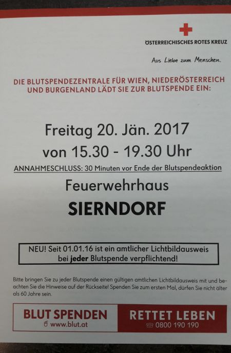 Am Freitag, den 20. Jänner von 15:30 bis 19:30Uhr findet wieder das alljähriche Blutspenden im Feuerhaus Sierndorf statt.