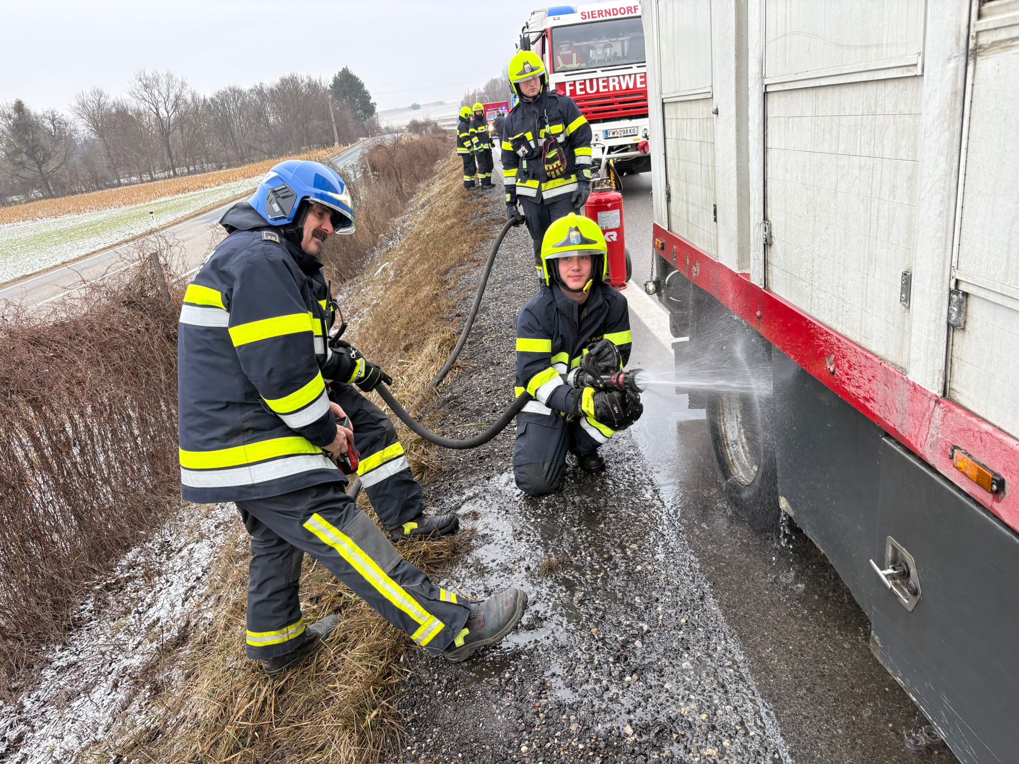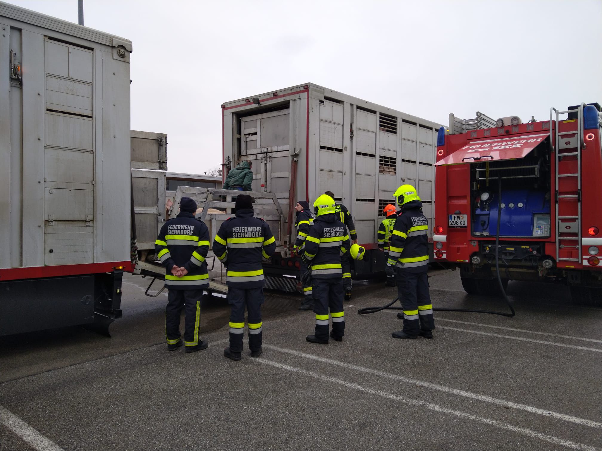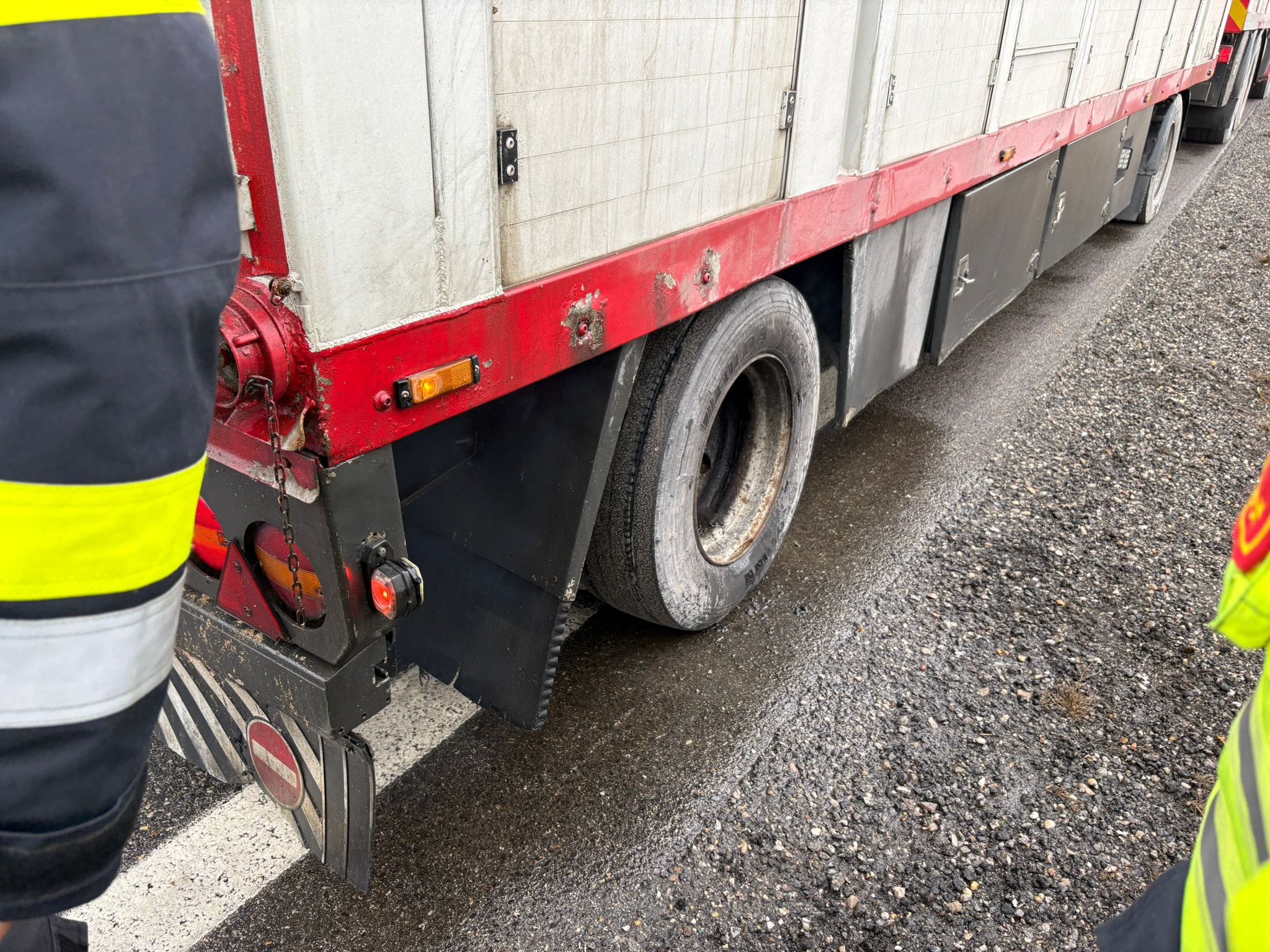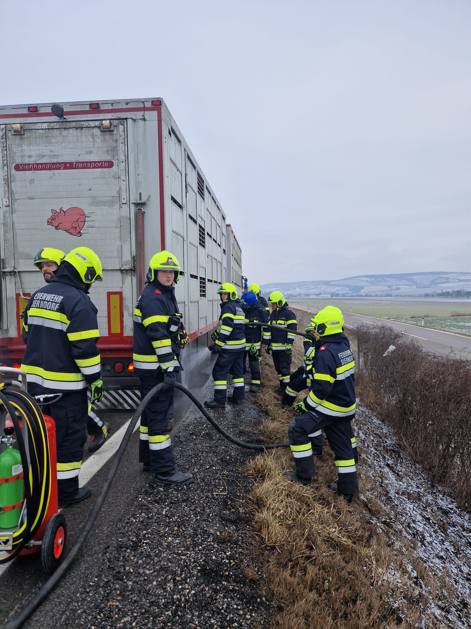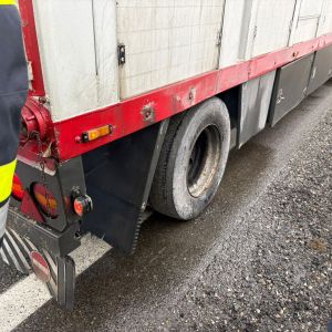 Zwischen Obermallebarn und Göllersdorf entstand bei einem mit Schweinen beladenen Viehtransporter aufgrund eines technischen Defektes an der Hinterachse des Hängers eine Rauchentwicklung.