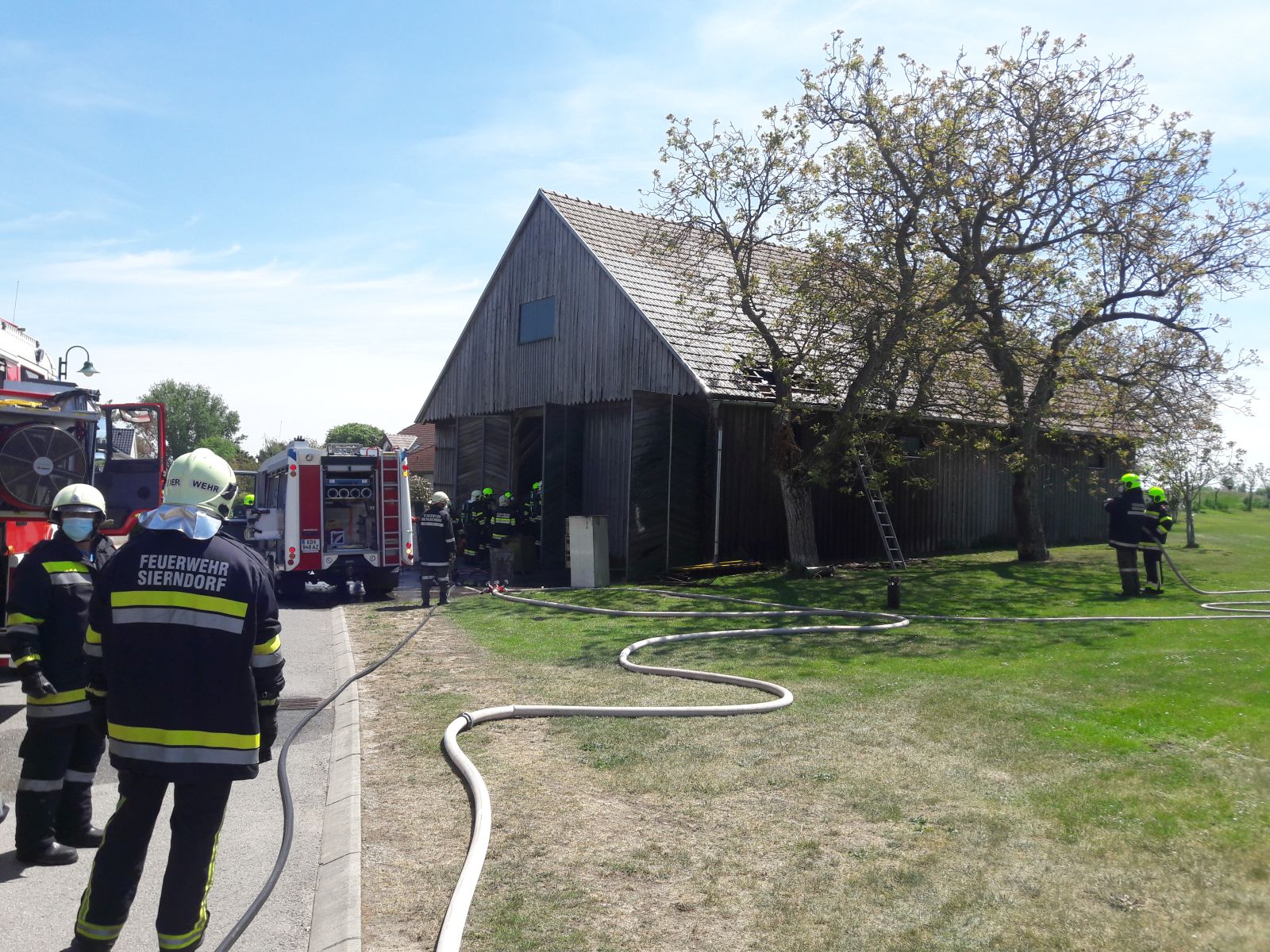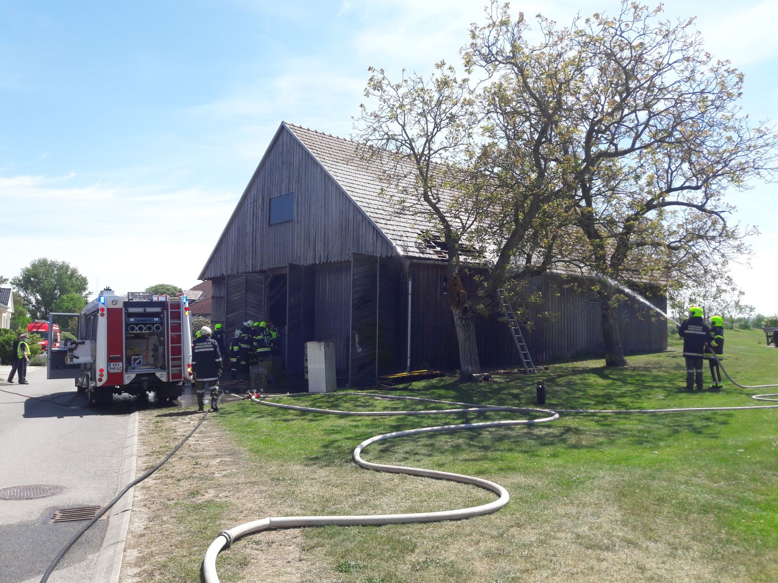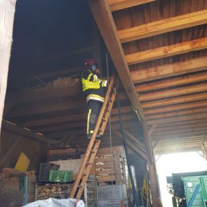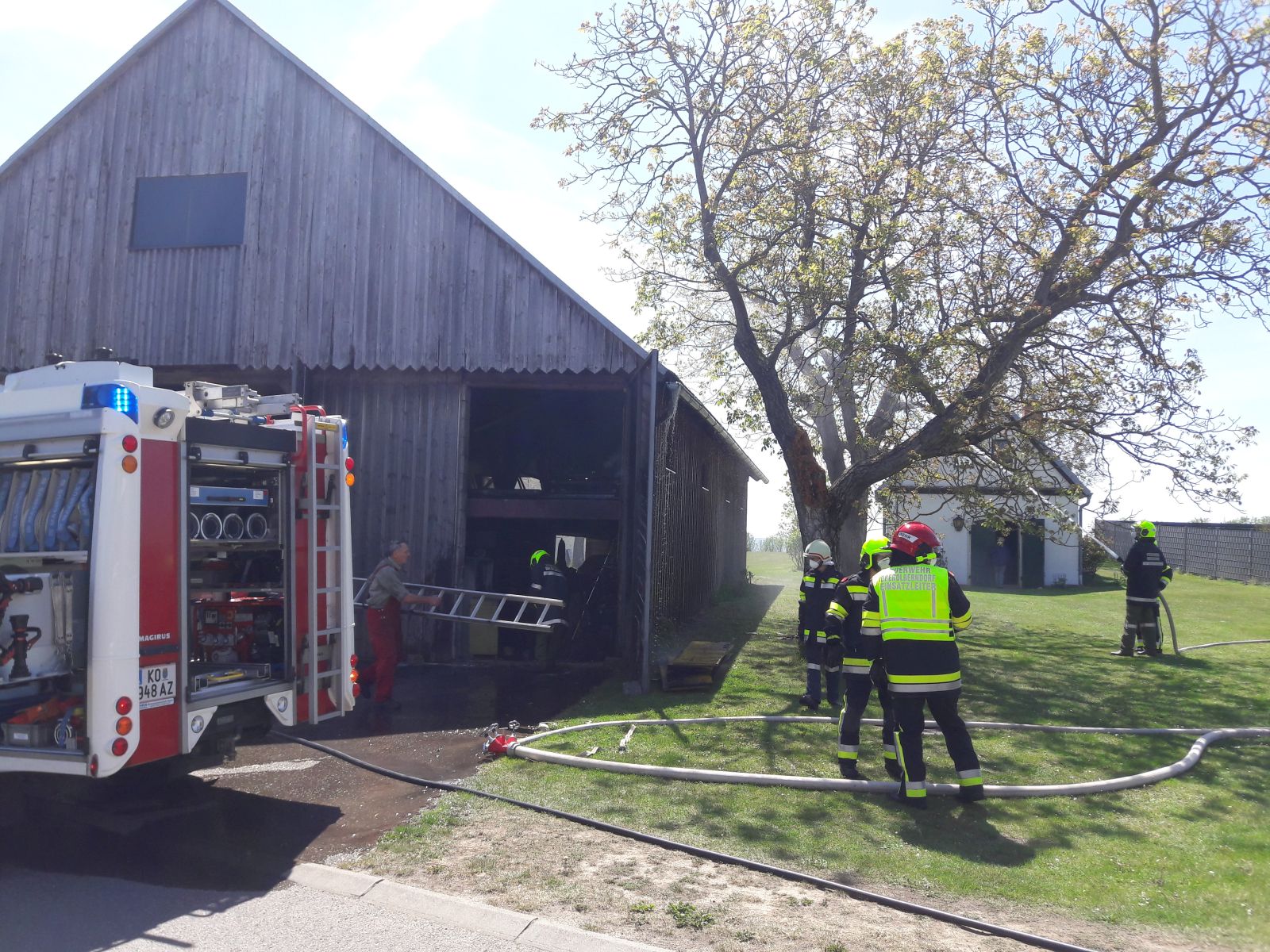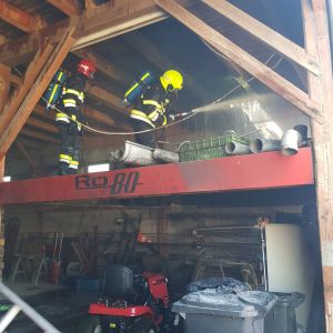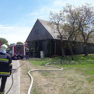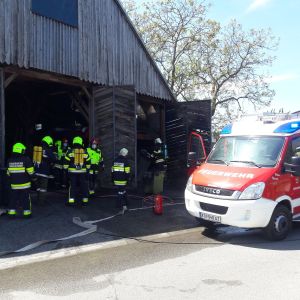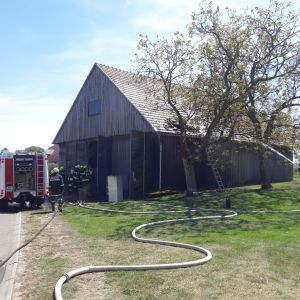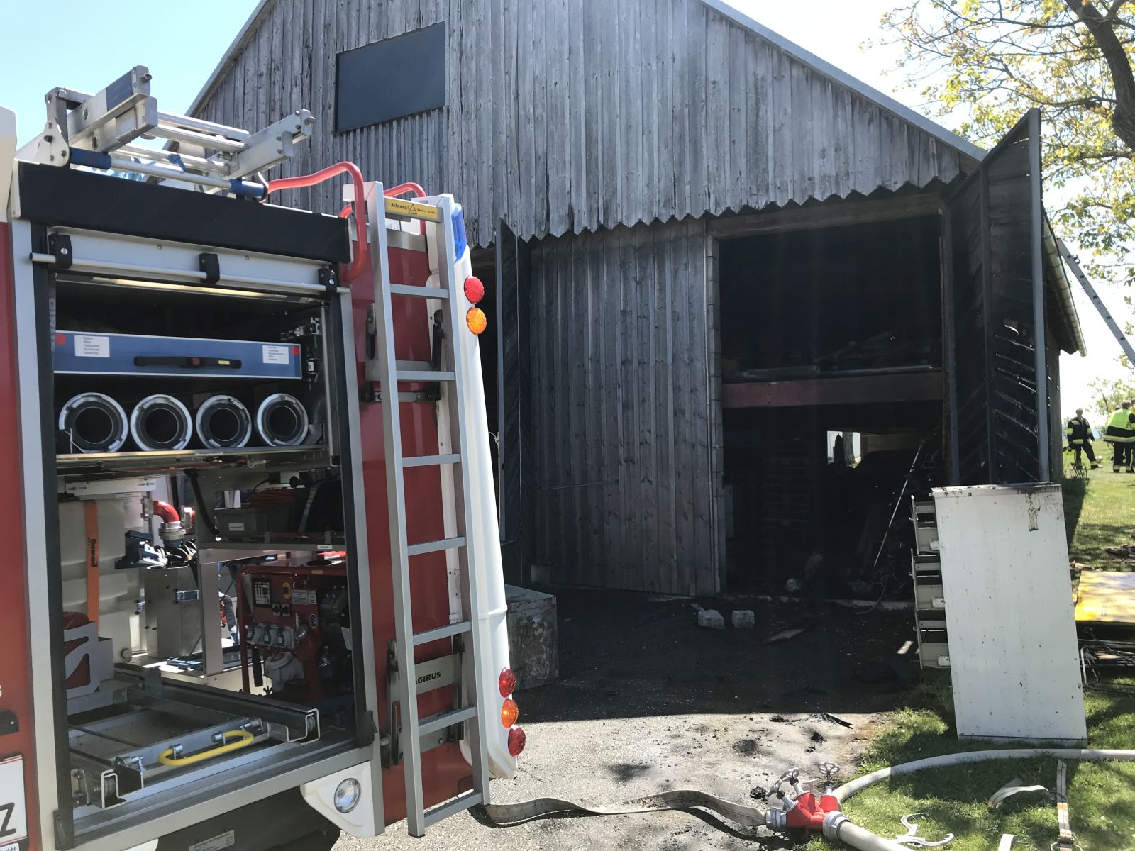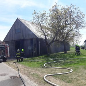 Am Zwischenboden der Scheune kam es zu einem Brand von Holzbrettern, das Feuer breitete sich auf die Scheunenwand und die Dachkonstruktion aus.