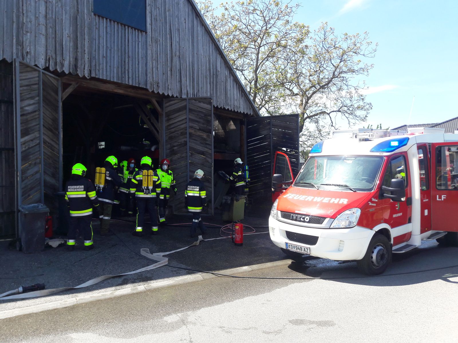 Bei unserem Eintreffen wurden bereits erste Löscharbeiten im Inneren der Scheune von der FF Oberolberndorf durchgeführt, der erste Atemschutztrupp des RLFA-2000 löste die Kameraden ab und konnte den Brandherd auf dem Zwischenboden lokalisieren. Ein Stapel Holzbretter hatte sich entzündet, das Feuer breitete sich auf die Holzwand und die Dachkonstruktion aus. Mittels der bereits verfügbaren Schnellangriffseinrichtung vom LF Oberolberndorf konnte der Brand rasch eingedämmt und abgelöscht werden.