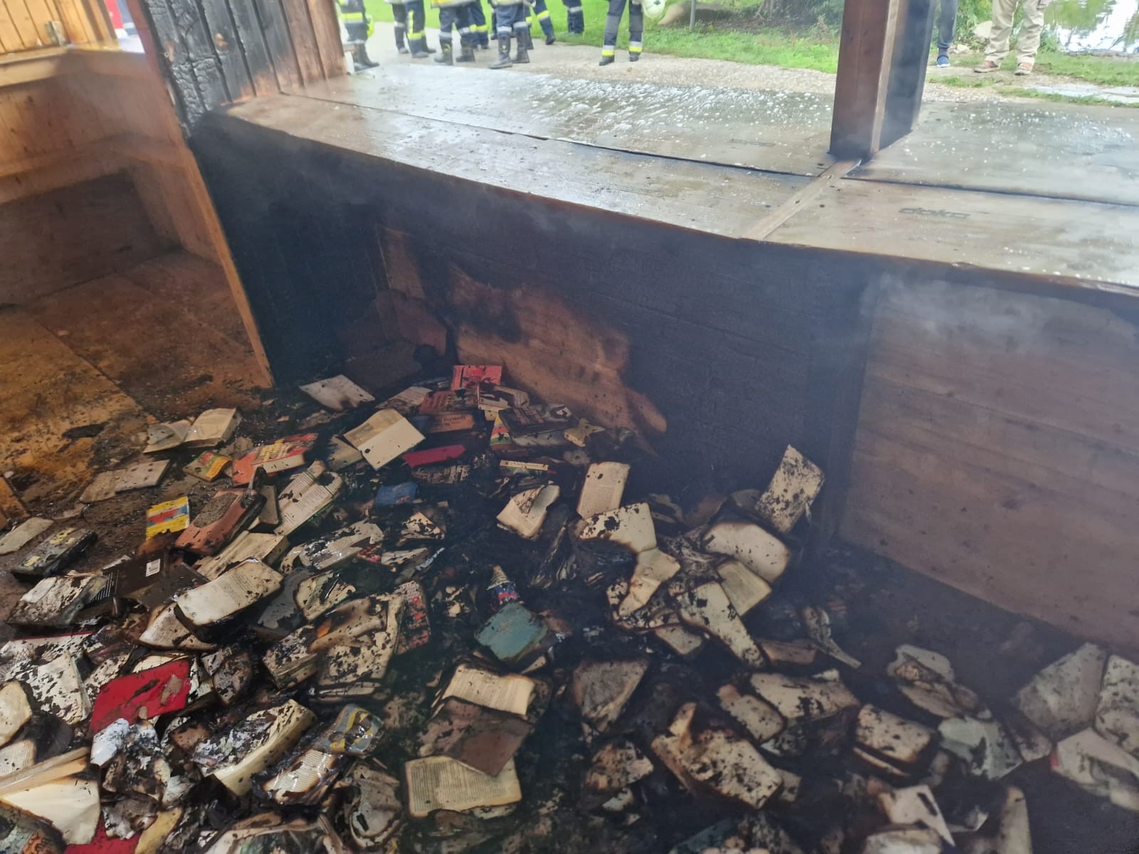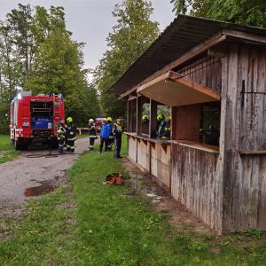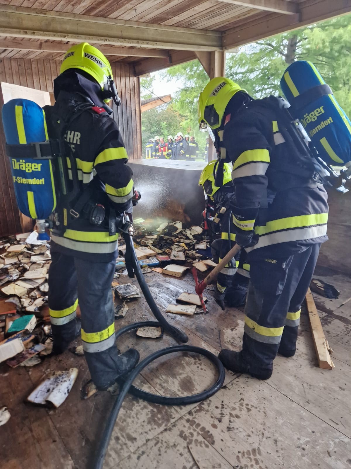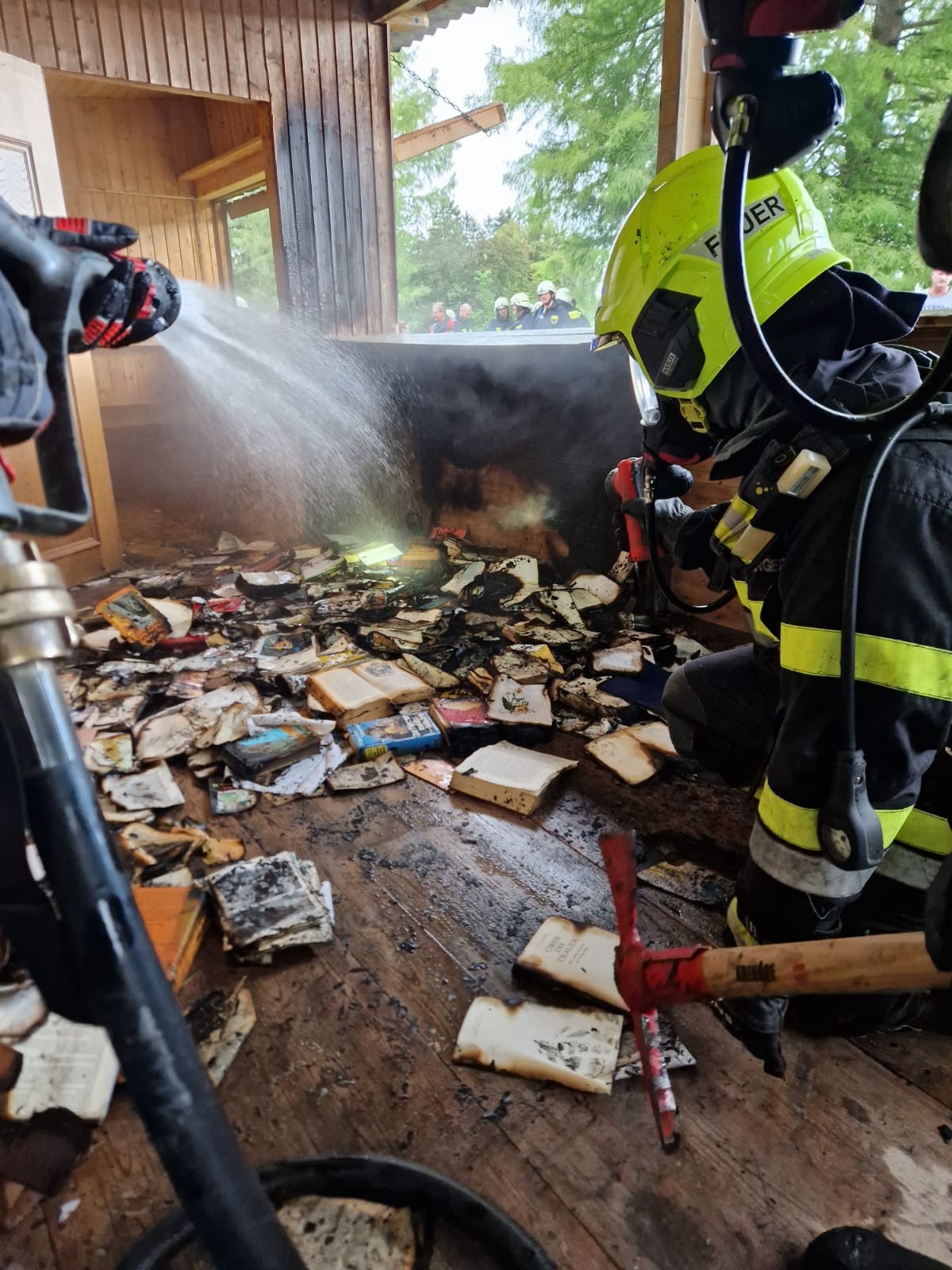 Trotz der engagierten Löschversuche hatte sich bei unserem Eintreffen bereits ein kleiner Brandherd im Inneren der Hütte gebildet. Unter Atemschutz konnte das Feuer aber rasch mit einem Hochdruck Strahlrohr gelöscht werden.