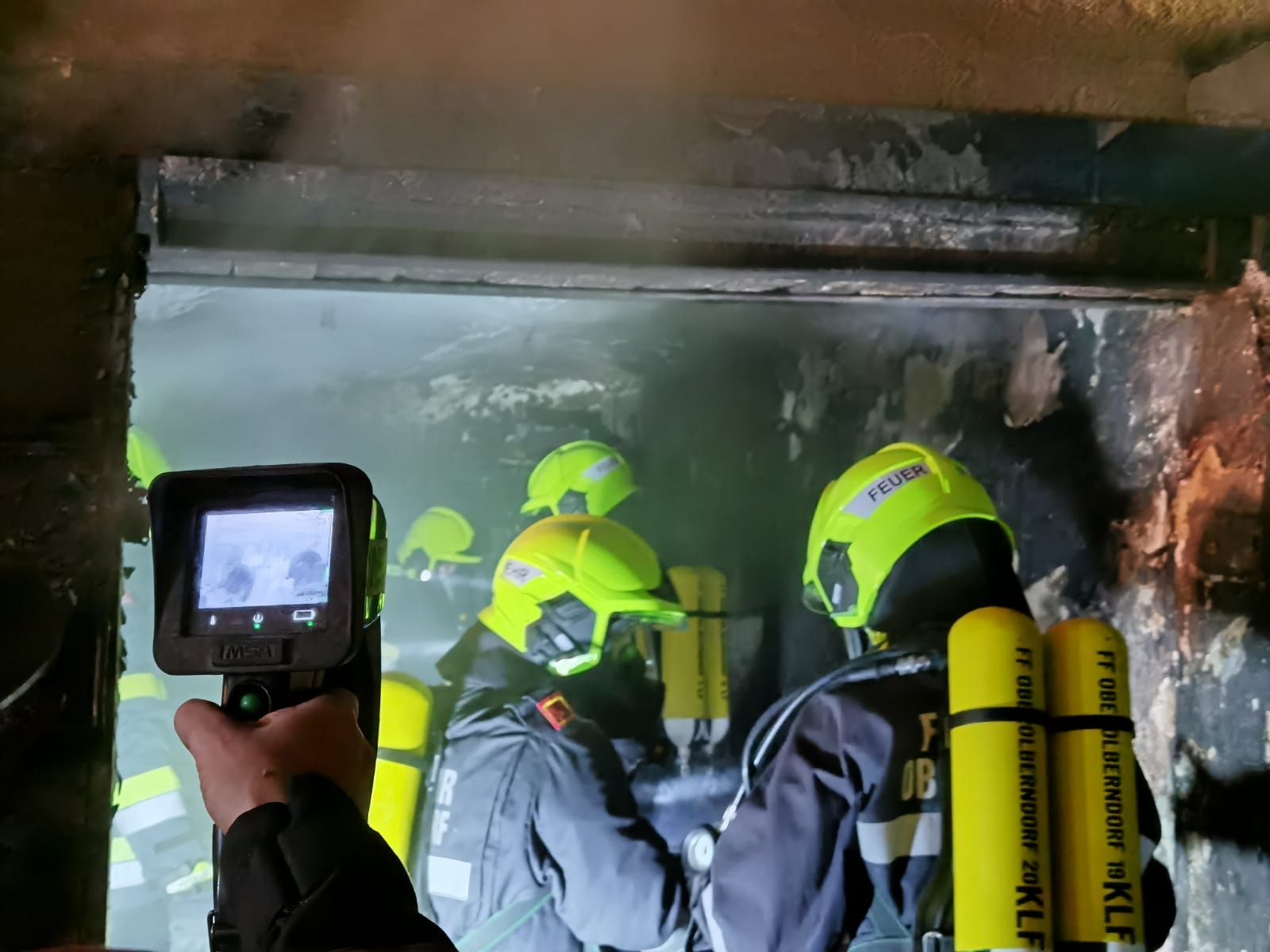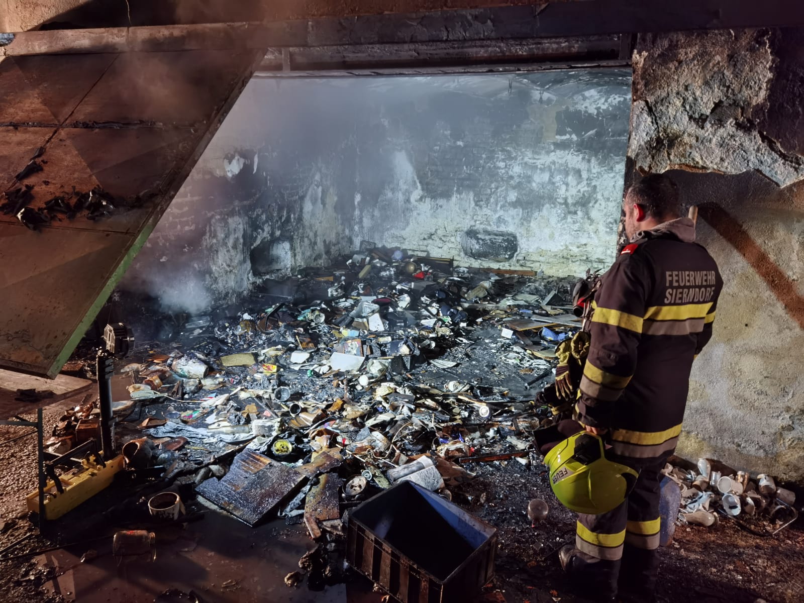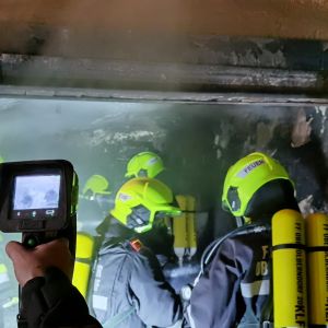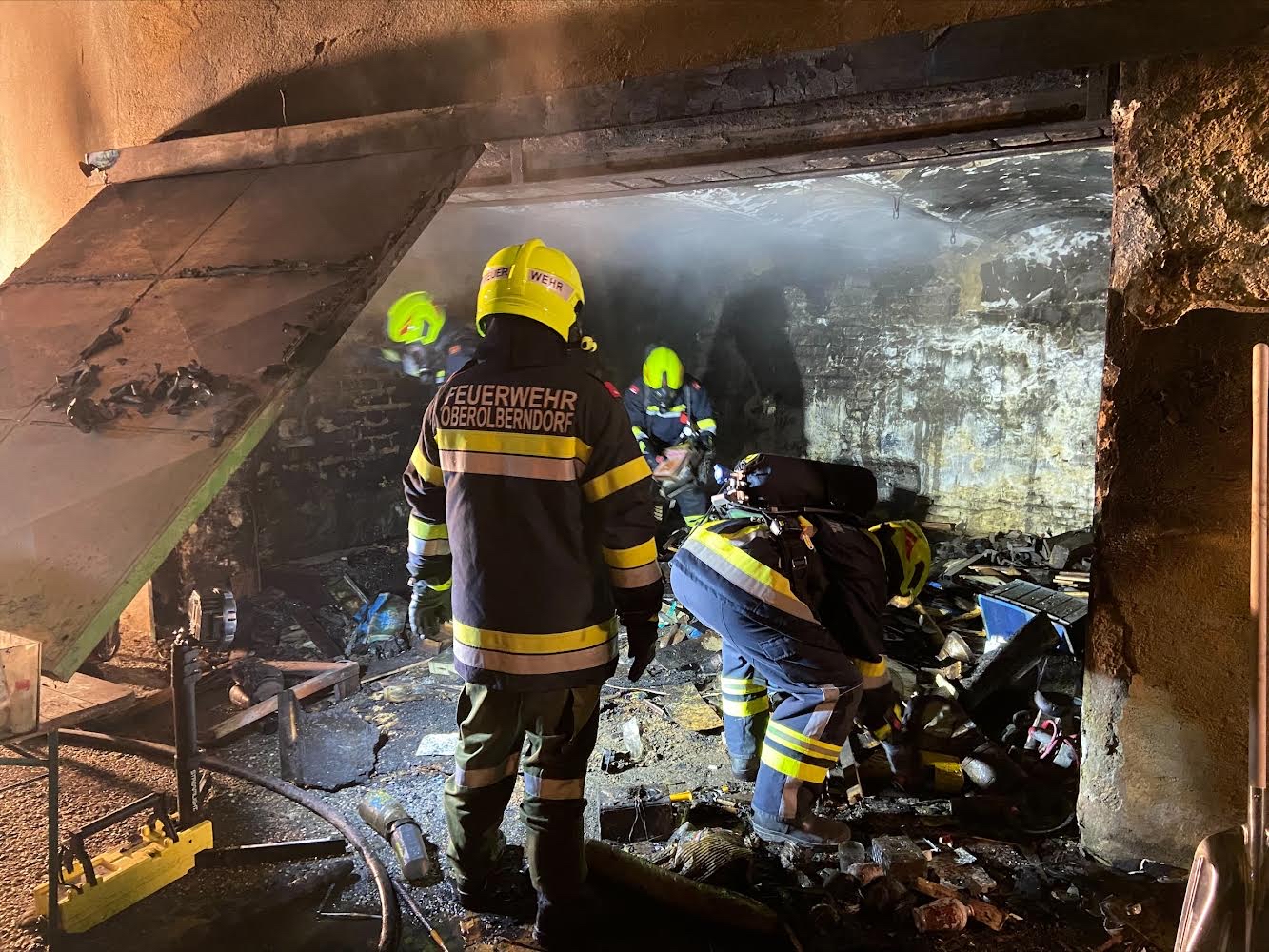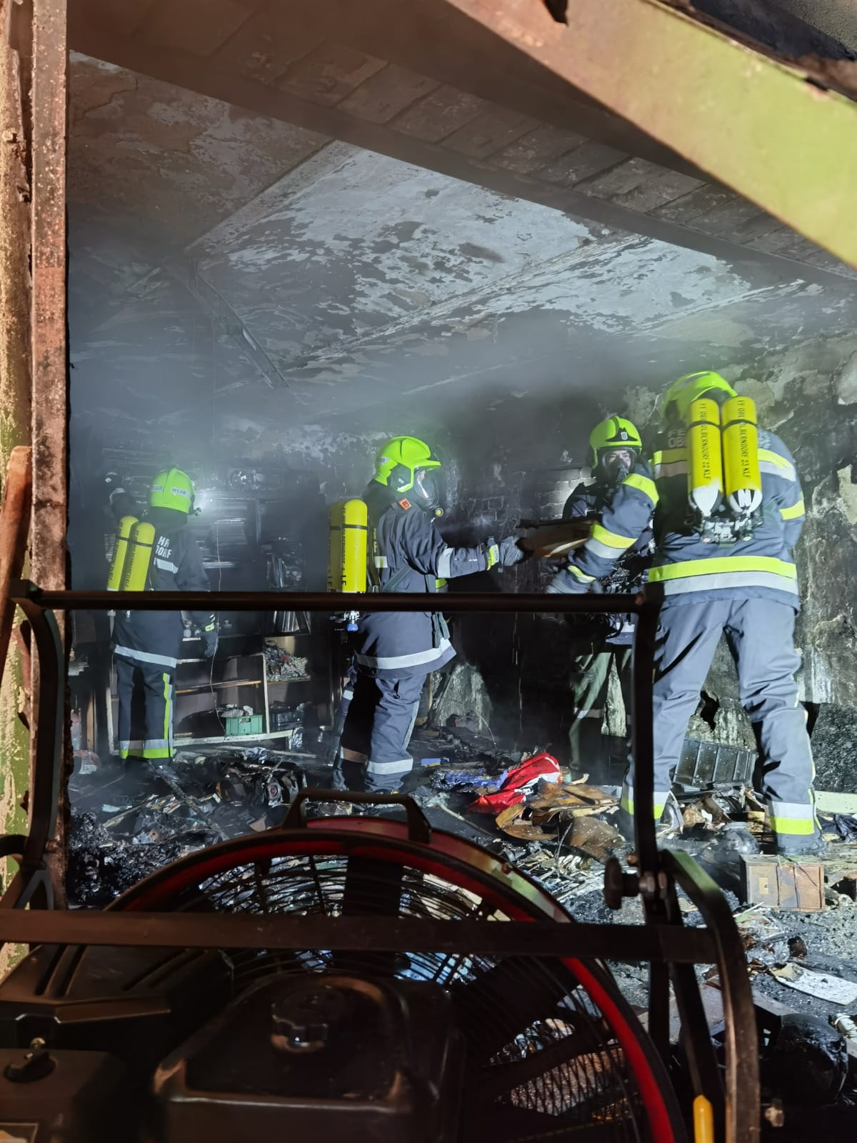 Nach kurzer Zeit konnte zwar "Brand Aus" gegeben werden, das Ausräumen des Lagerraumes unter schwerem Atemschutz nahm allerdings noch Zeit in Anspruch. Mittels Wärmebildkamera wurde permanent nach Glutnestern gesucht und das Gebäude kontrolliert.
