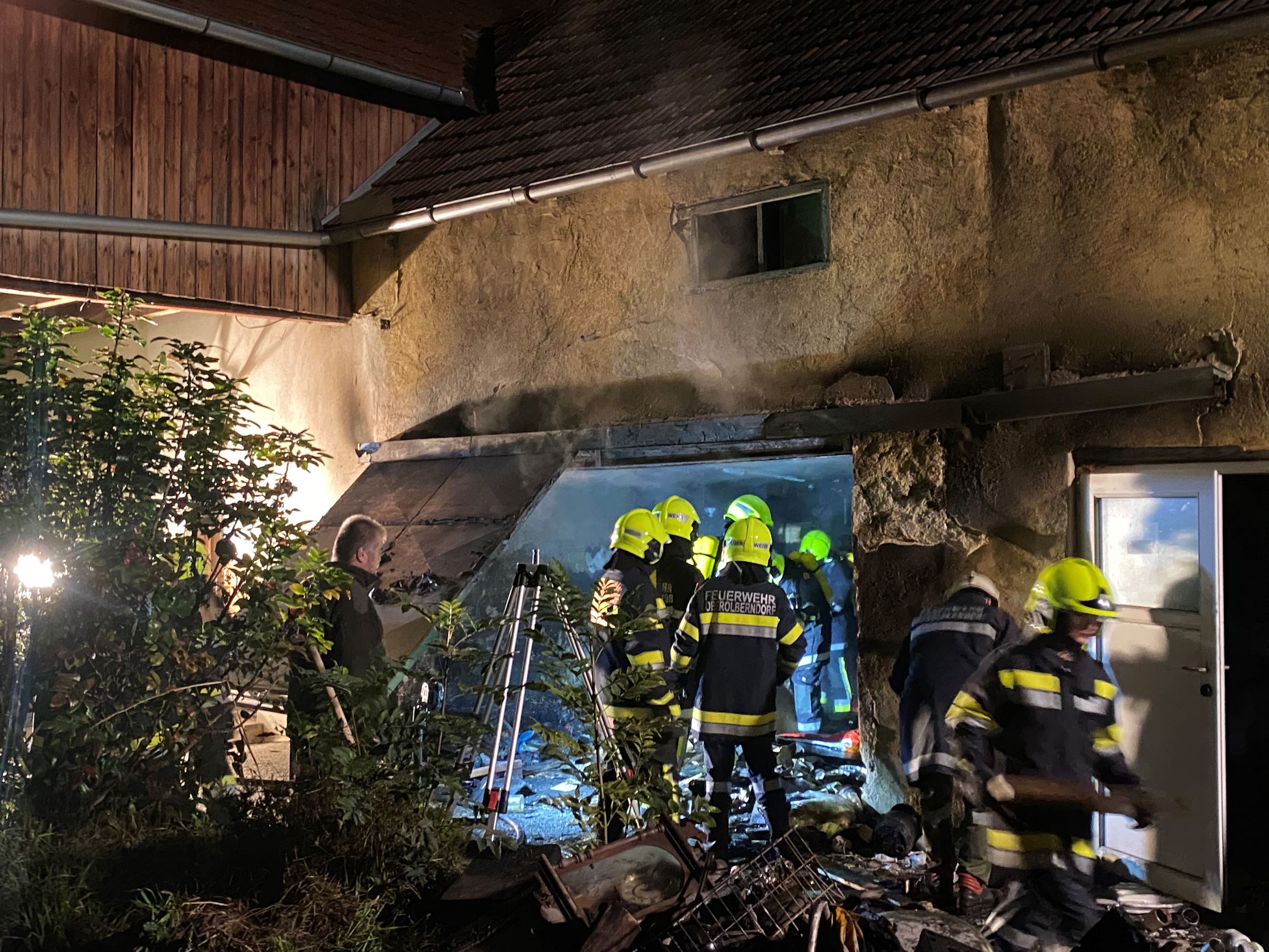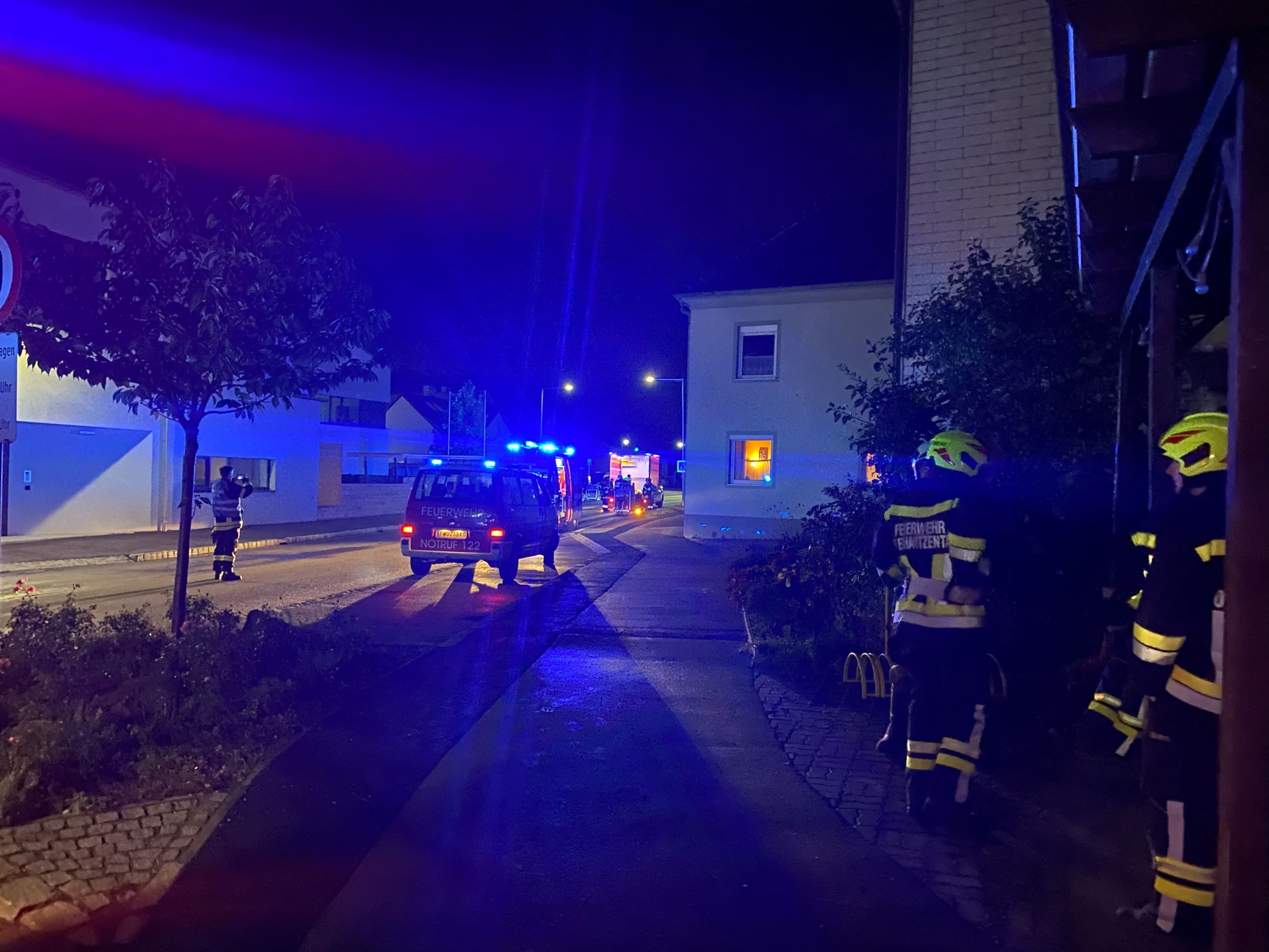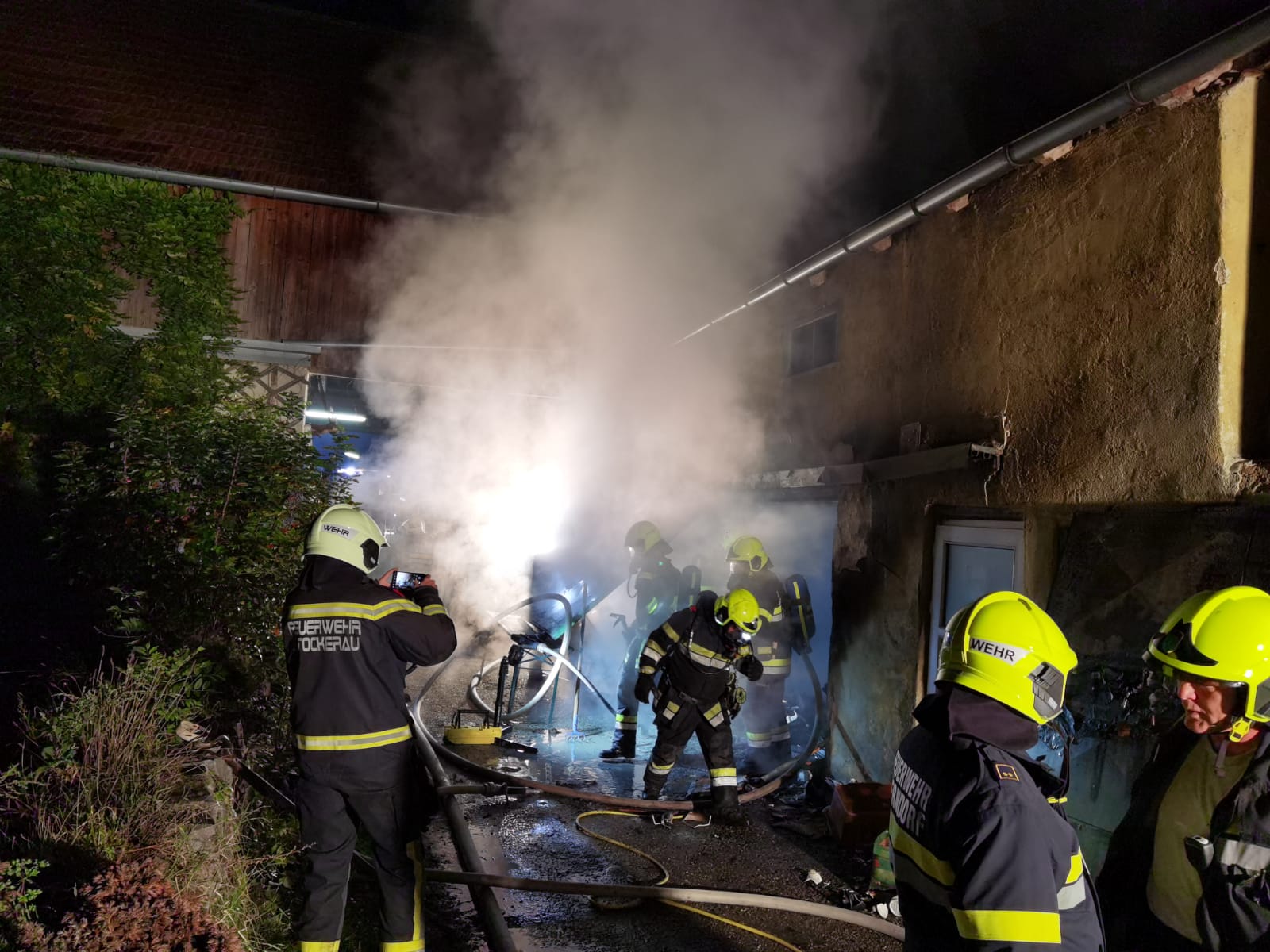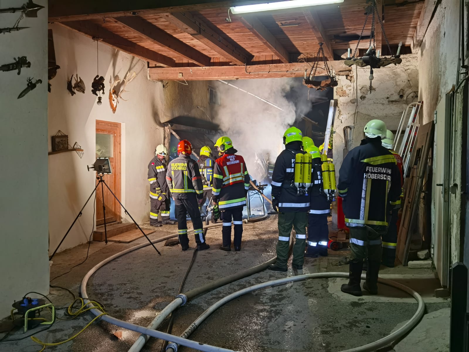 Bei der Erkundung konnte ein Brand und dichter Rauch in einem mit Hausrat voll geräumten Lagerraum festgestellt werden. Aufgrund der zu erwartenden Anzahl an Atemschutztrupps und der Lage im Gebäudeverbund mitten im Ortszentrum wurde die Alarmstufe auf B3 erhöht und die Feuerwehren Oberhautzental, Höbersdorf und Stockerau nachalarmiert.