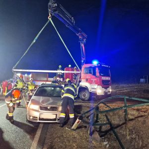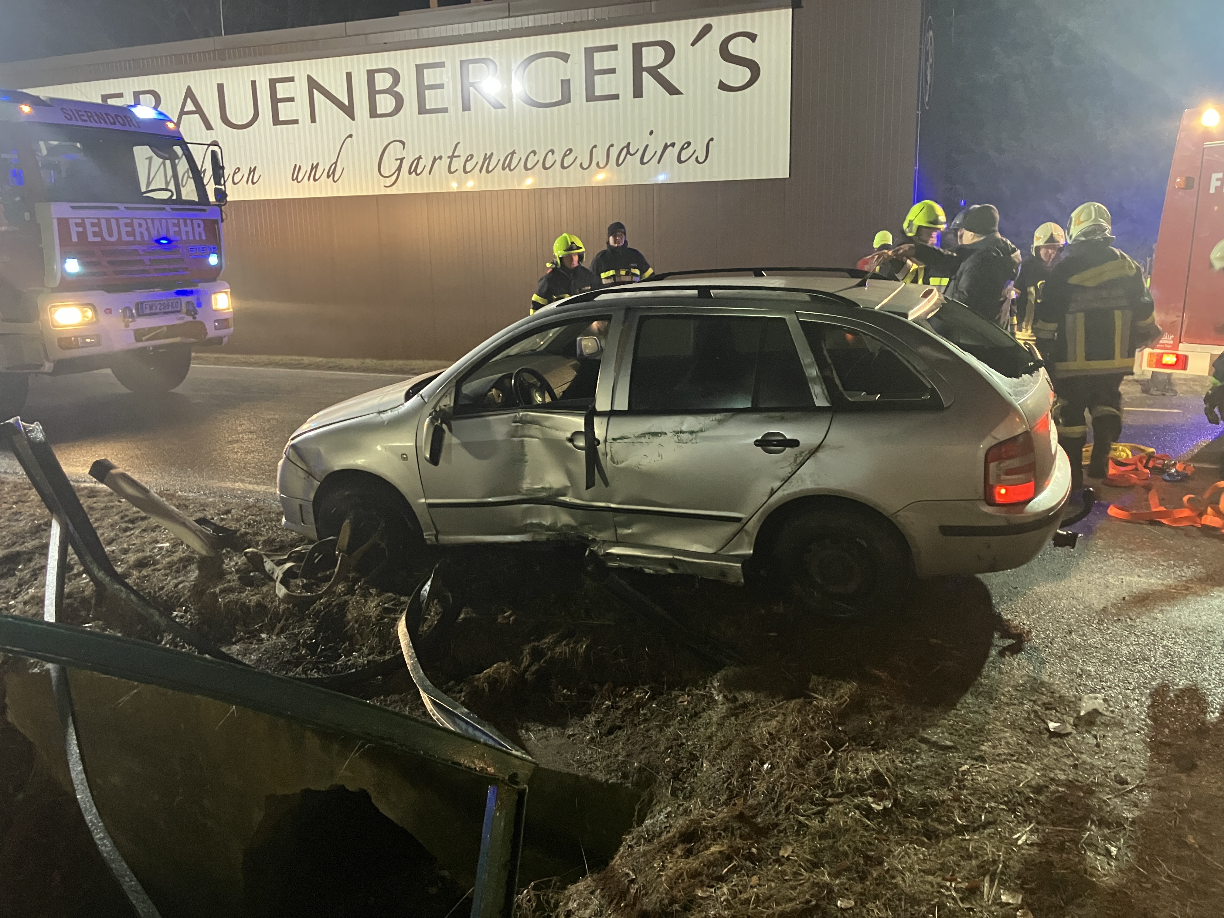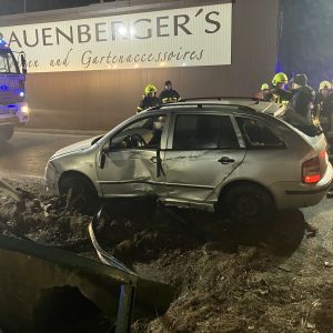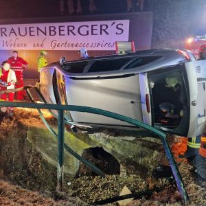 Ein PKW kam vermutlich aufgrund der eisglatten Fahrbahn von der Strasse ab und krachte mit der Fahrerseite in das Geländer eines Wassergrabens. Der PKW blieb seitlich auf der Fahrerseite am Geländer in ca. 2m Höhe über dem Wassergraben hängen, die Fahrerin blieb nahezu unverletzt, konnte sich aber nicht selbst befreien.
