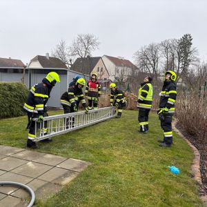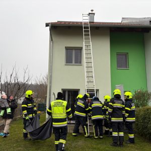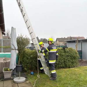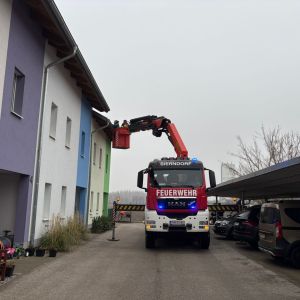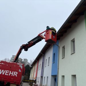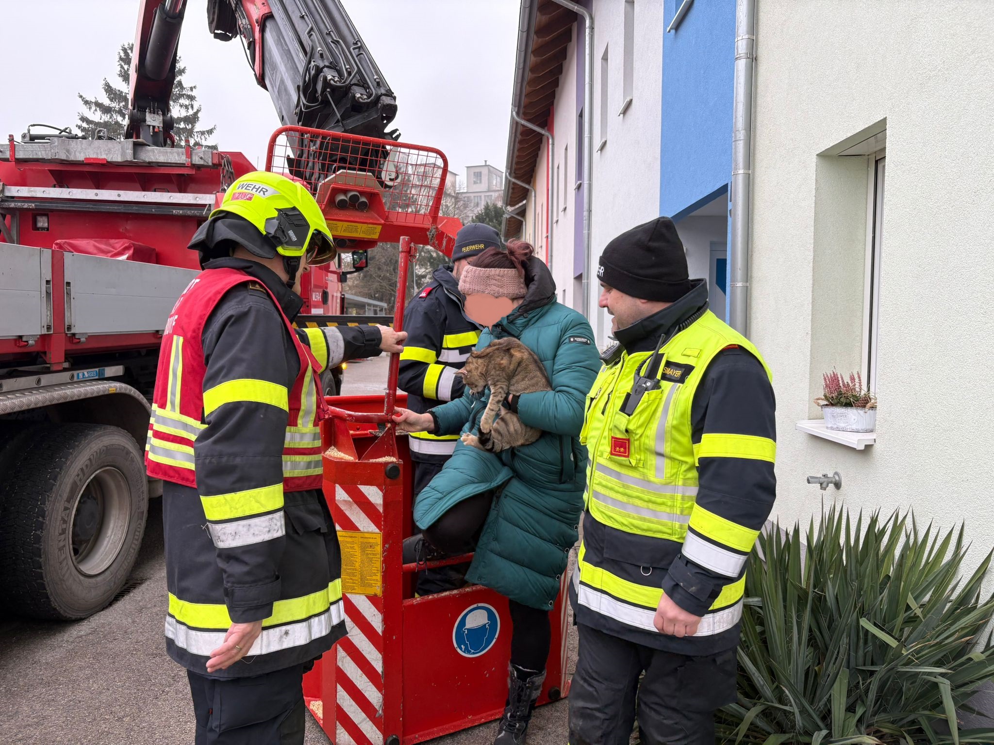 Ein Kamerad stieg mittels Schiebeleiter auf der einen Dachseite hoch und konnte den Vierbeiner auf die andere Seite des Daches treiben, wo ihn die Besitzerin und ein Kamerad im Arbeitskorb des WLFA-K einfangen konnten.