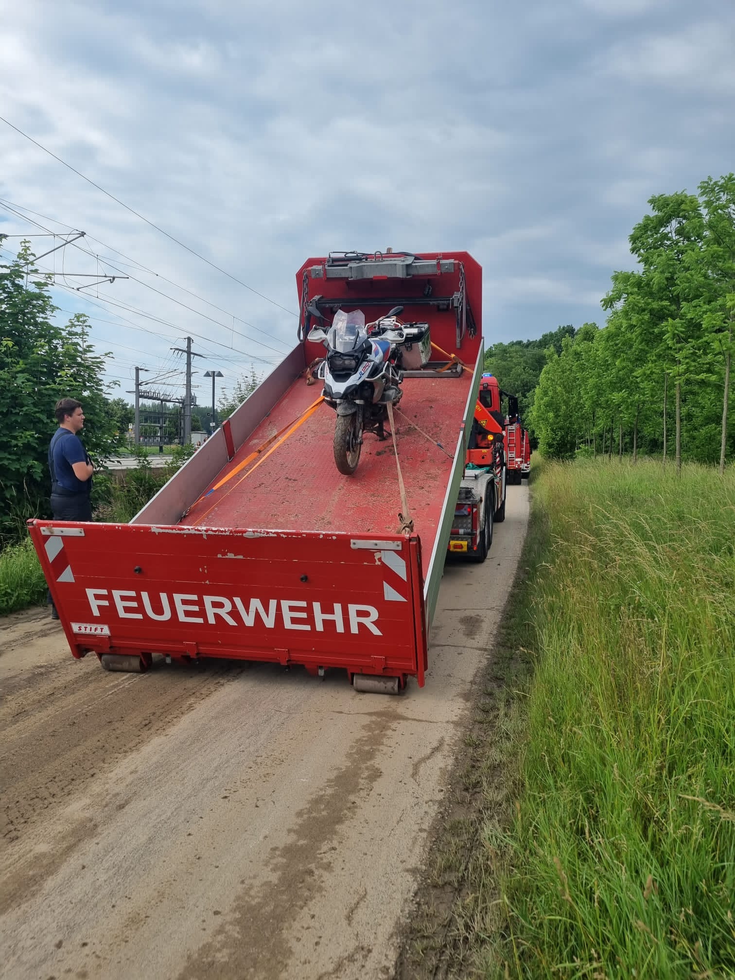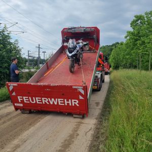 Nach der Unfallaufnahme durch die Polizei und Versorgung des Verletzten durch das Rote Kreuz, wurde das Motorrad auf das Abschleppplateau des WLFA-K verladen und abtransportiert.