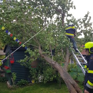 Dort war ein Baum auf eine Gartenhütte gestürzt. Der Baum konnte rasch zersägt werden und eine weitere Beschädigung der Hütte abgewehrt werden.