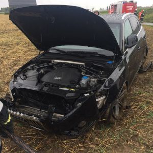 Ein in Richtung Hollabrunn fahrender PKW kam vermutlich aufgrund Aquaplanings von der Fahrbahn ab und landete im Acker. Bei dem Aufprall wurde das rechte Vorderrad ausgerissen.