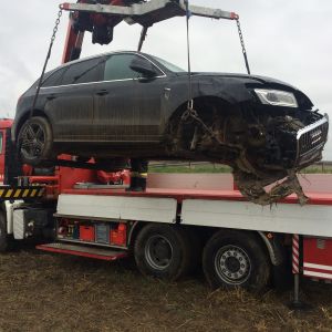 Mittels Hebekreuz wurde der PKW auf das Abschleppplateau des WLF-K verladen und an einer für den Abschleppdienst leichter zugänglichen Stelle abgestellt.