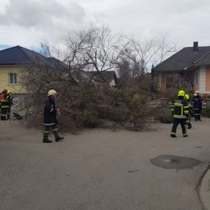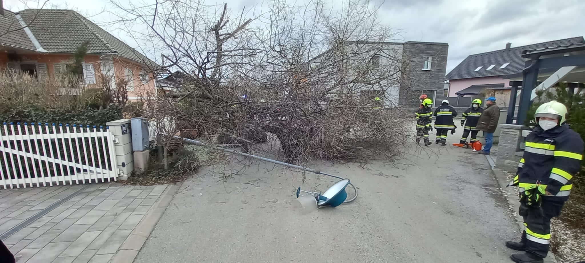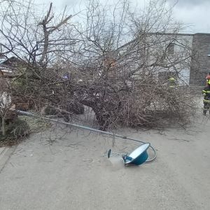 Aufgrund des starken Windes stürzte ein Baum auf die Straße. Dabei wurde auch eine Laterne der Straßenbleuchtung umgeknickt.