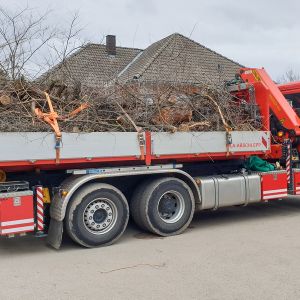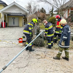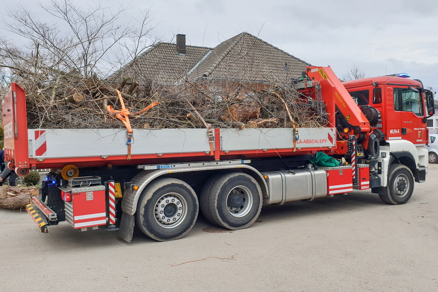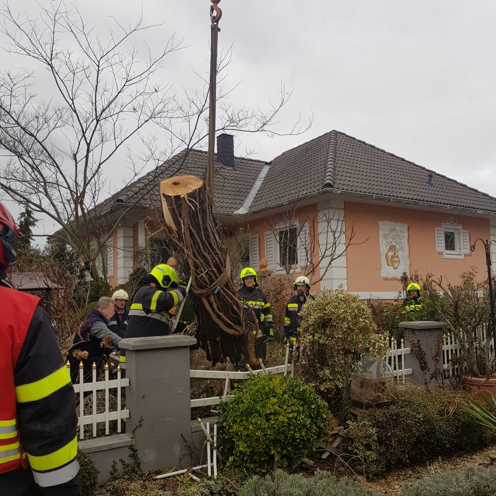 Gemeinsam mit den Kameraden der FF Oberolberndorf wurde der Baum zerlegt und auf das Plateau des WLFA-K geladen, der Stamm konnte mit dem Ladekran vom Zaun bzw. aus dem Garten gehoben werden.