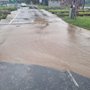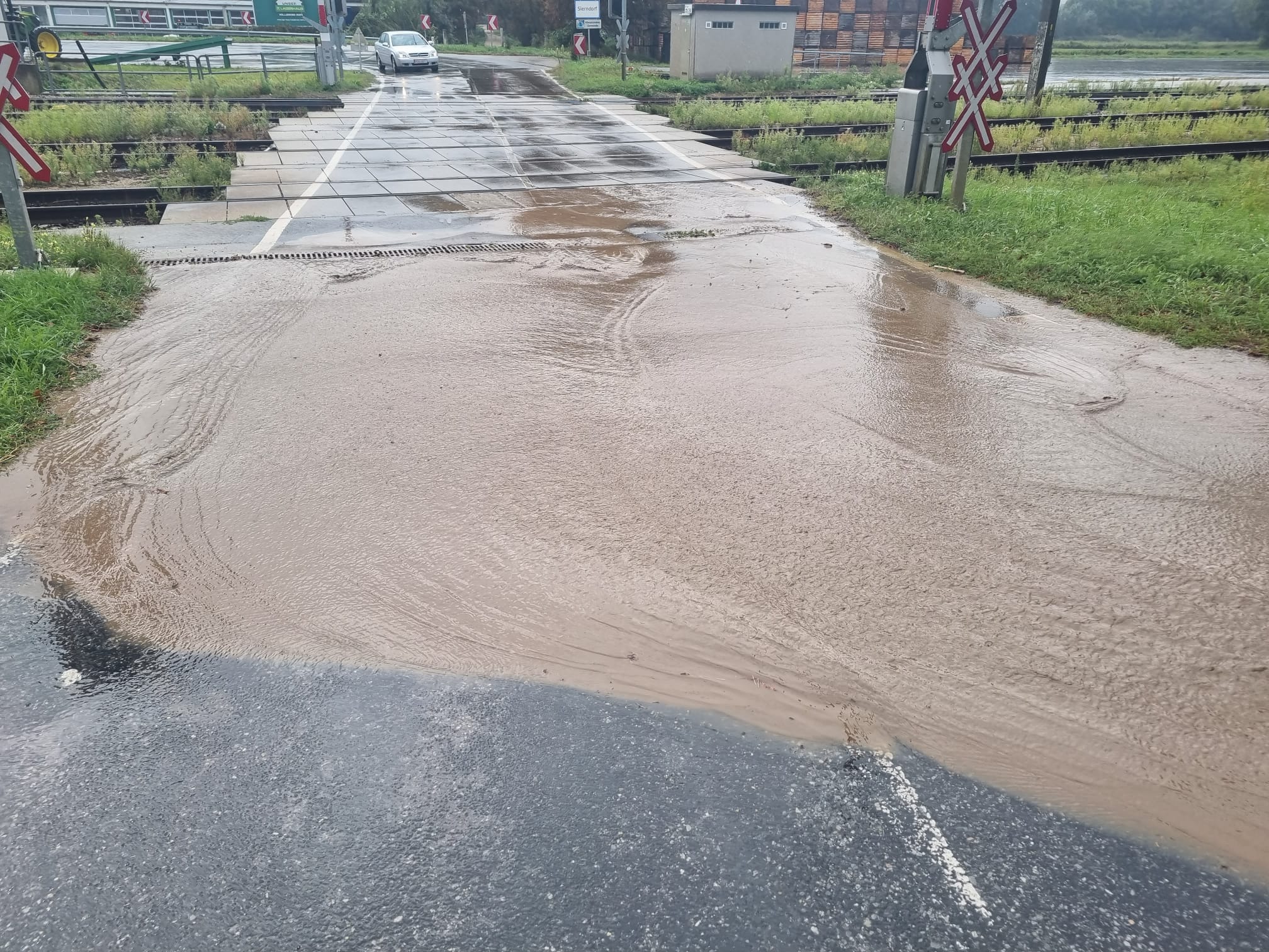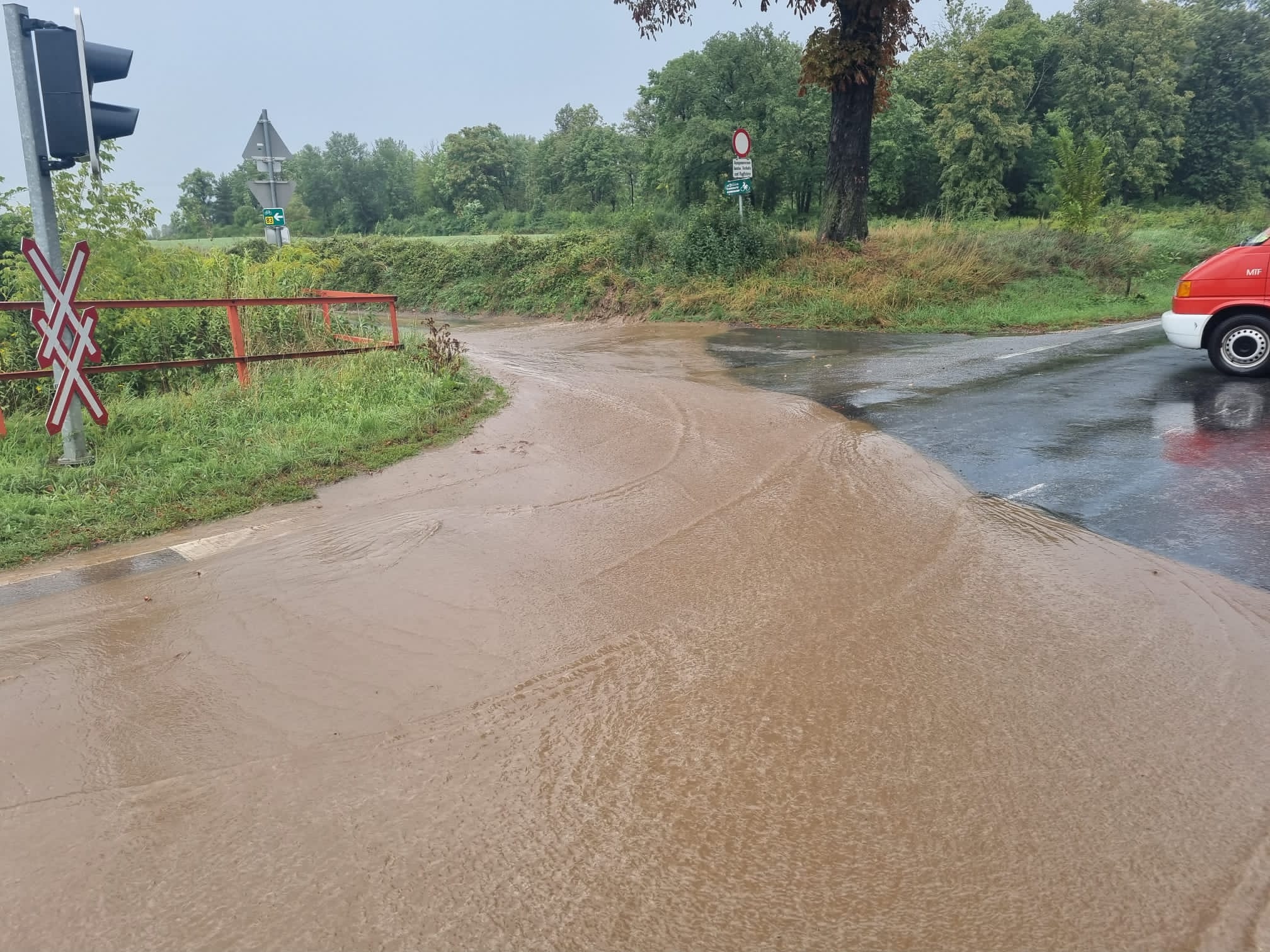 Auf der L31 Richtung Hatzenbach wurde Schlamm von den angrenzenden Feldern auf den Bahnübergang geschwemmt.