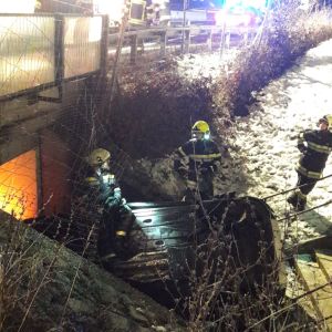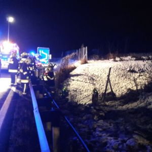 Ein PKW war aus ungeklärter Ursache von der Fahrbahn abgekommen, im Straßengraben der Leitschiene entlang geschlittert und schließlich auf dem unter der Fahrbahn querenden Weg seitlich liegend zum Stillstand gekommen.