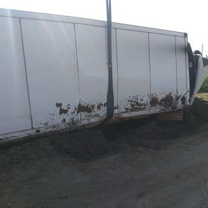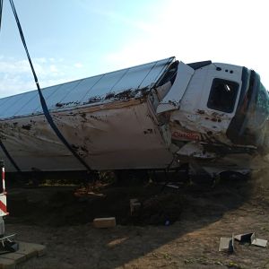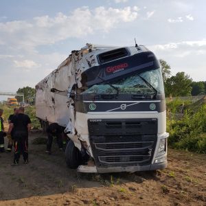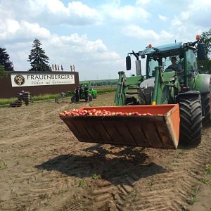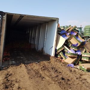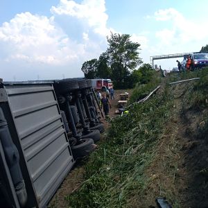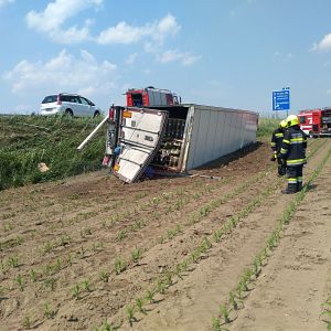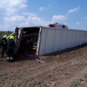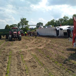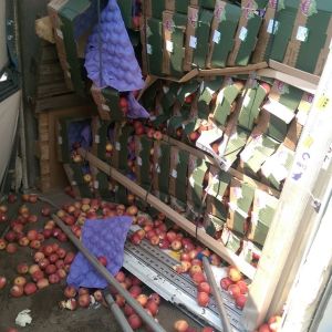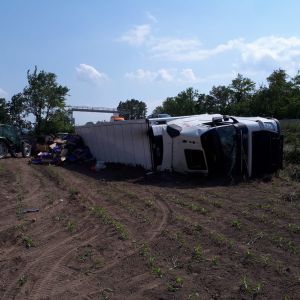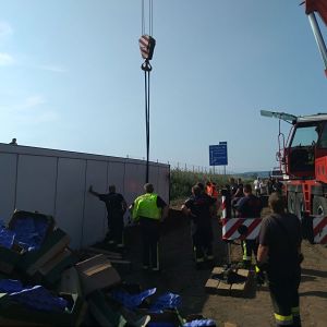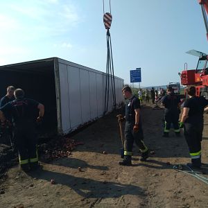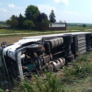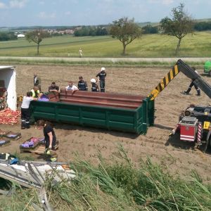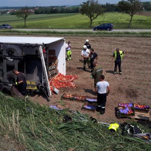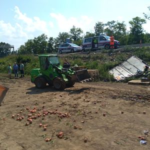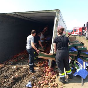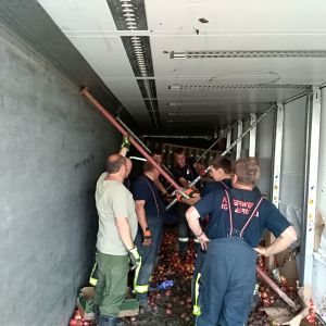 Ein voll mit Äpfel beladener Sattelschlepper war aus unbekannter Ursache über den Fahrbahnrand hinaus gekommen, über die Böschung gestürzt und schließlich im angrenzenden Feld seitlich zum Liegen gekommen.