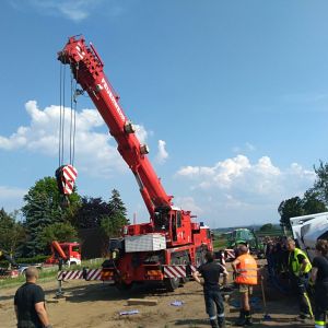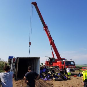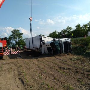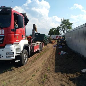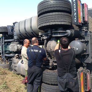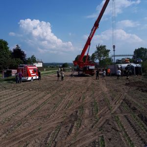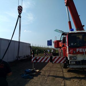 Am Zugfahrzeug wurde in der Zwischenzeit auch die Kardanwelle ausgebaut um das spätere Abschleppen zu ermöglichen. Nachdem der Anhänger leergeräumt war konnte das Kranfahrzeug der FF Hollabrunn in Stellung gebracht werden. Vor dem Anheben wurde noch der Anhänger innen mit Deckensteher stabilisiert. Dann wurde der LKW aufgerichtet und gleichzeitig mit der Seilwinde unseres RLFA-2000 von der Böschung gezogen.