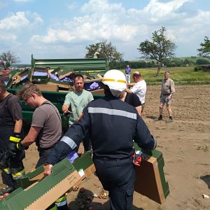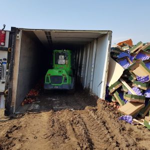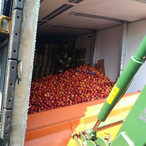 Um an die Ladung zu kommen mussten zuerst die Heckklappen mittels Seilwinde entfernt werden. Danach musste der Sattelaufleger zum Großteil händisch entladen werden. Karton für Karton. Unterstützung gab es durch Traktoren mit Frontlader und Anhänger sowie durch den Avant Bagger der Gemeinde. Die Äpfel und Kartonagen wurden in Mulden verladen und entsorgt.