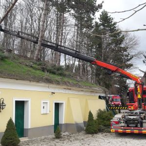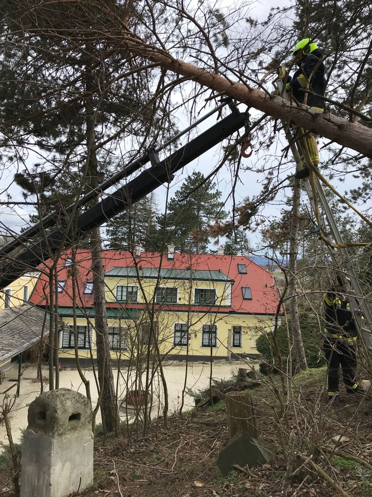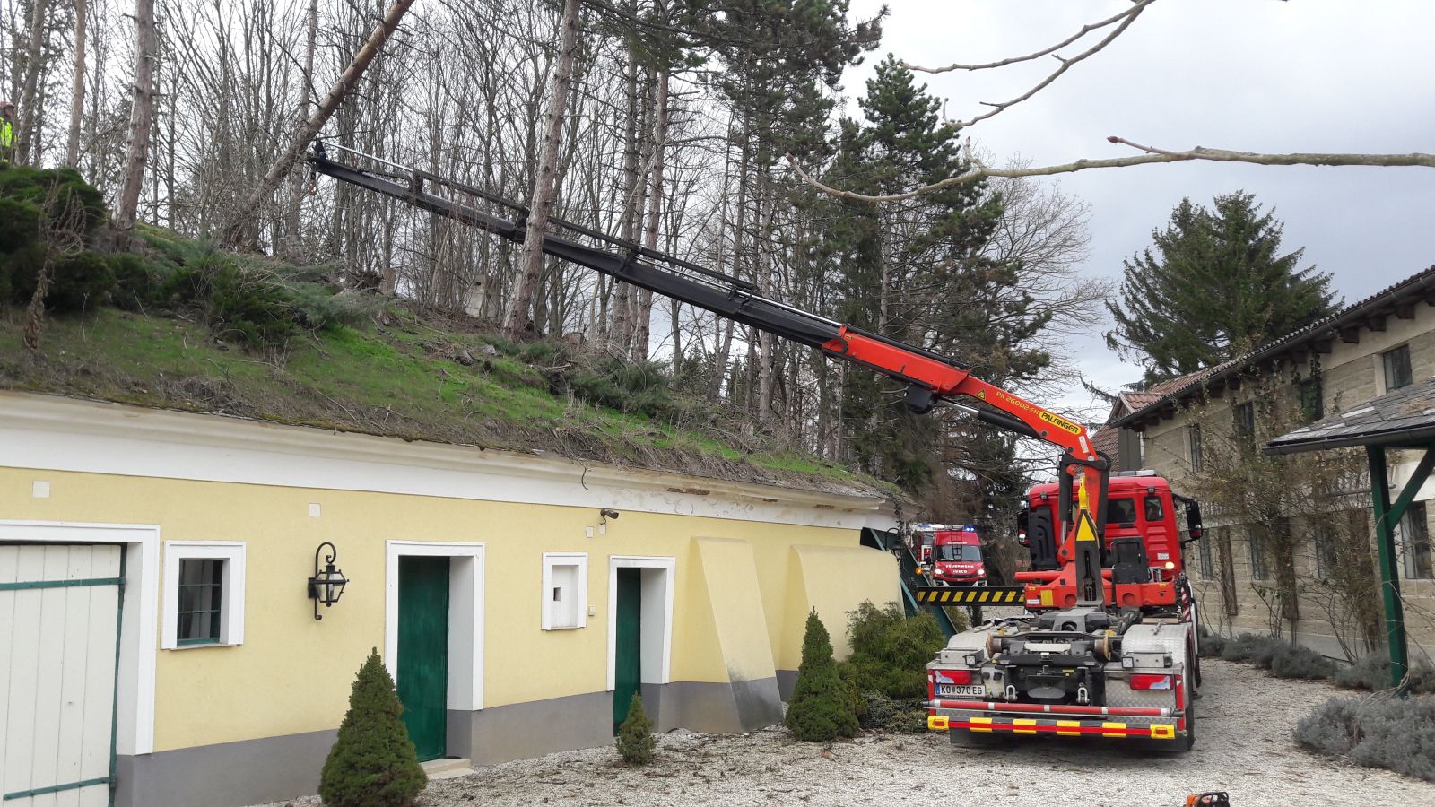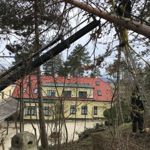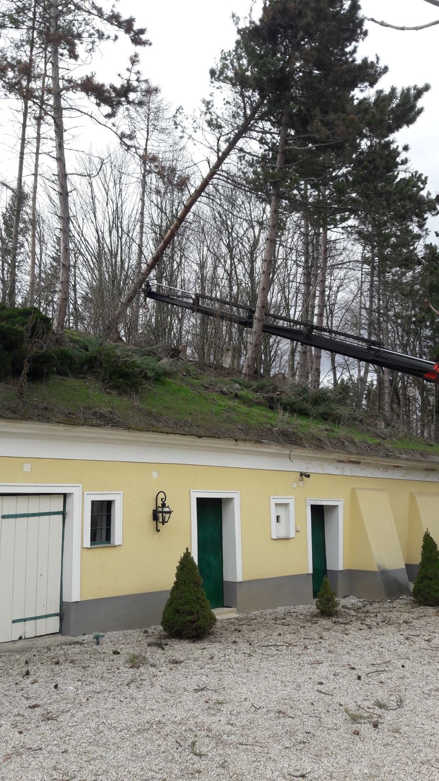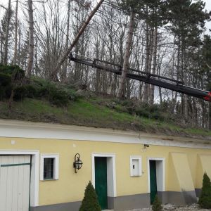 Der schon ganz schief stehende Baum wurde mit dem WLFA-Kran gesichert und im Anschluss in mehreren Stücken gezielt abgetragen.
