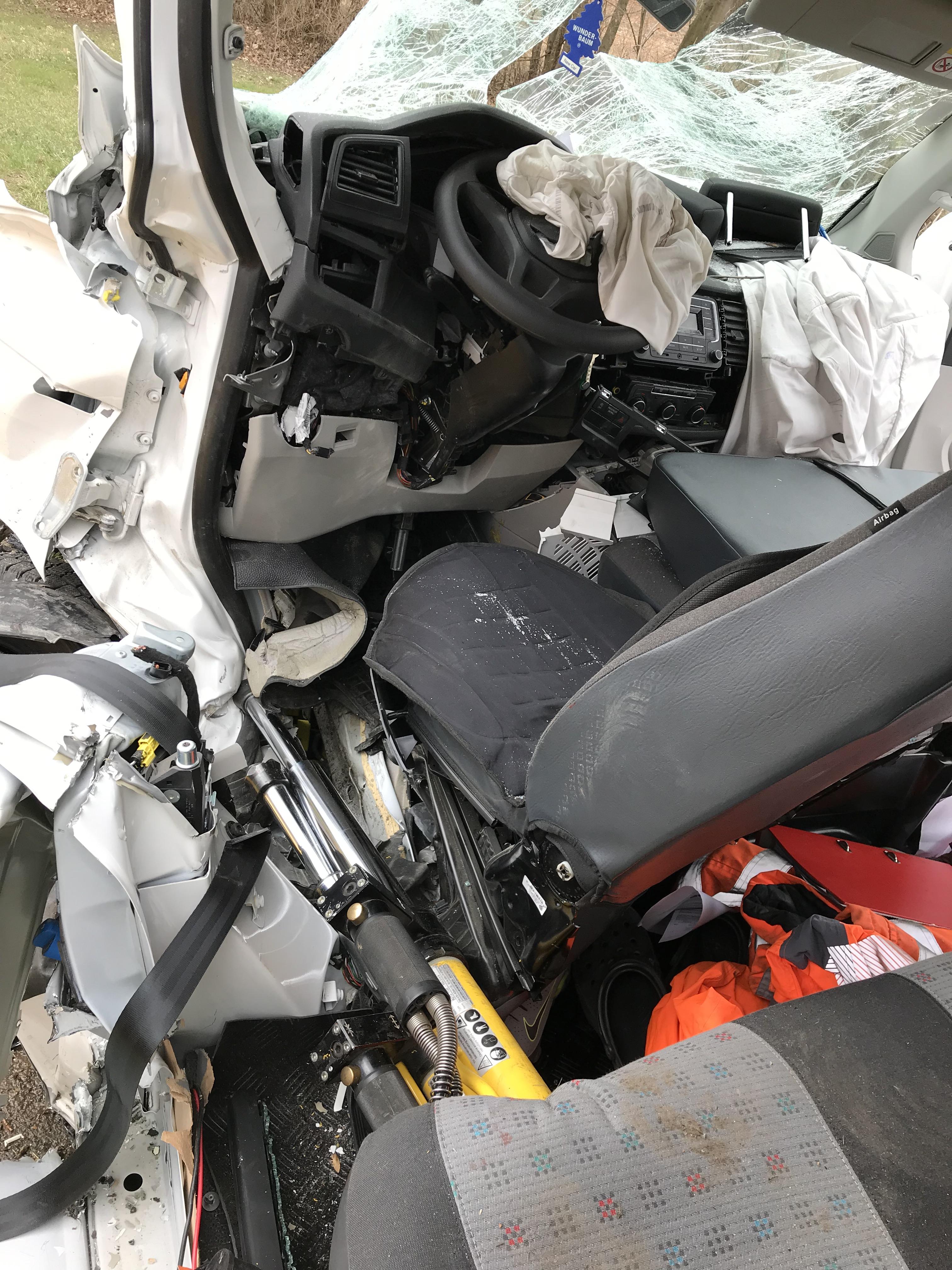 Nach Erkundung der Lage begannen wir sofort mittels zweier hydraulischer Rettungszylinder die Beine des zum Glück ansprechbaren Fahrers zu befreien, parallel dazu wurde der Brandschutz aufgebaut.