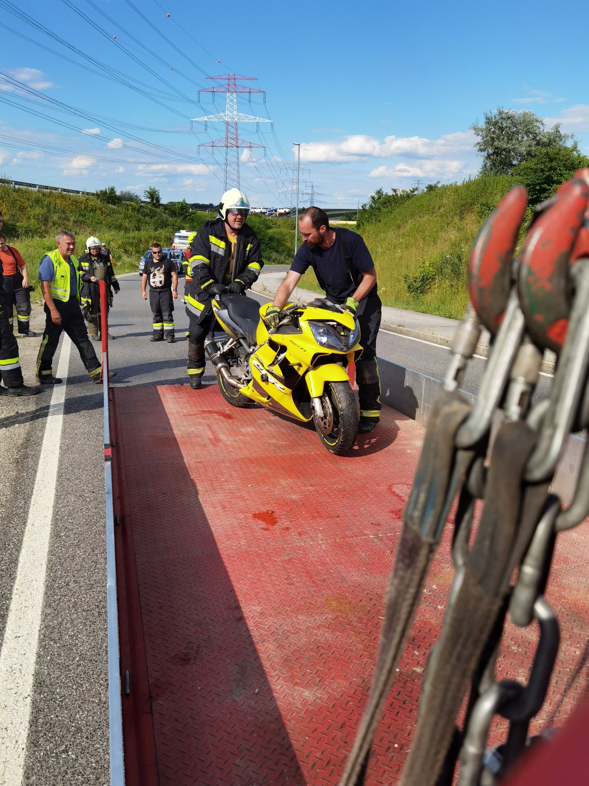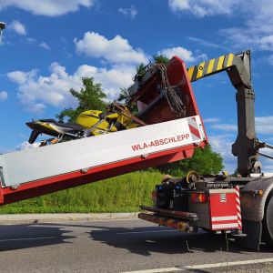 Bis zum Eintreffen der Rettung wurde der Fahrer von uns erstversogt. Danach übernahm die Rettung die Versorgung und brachte den Lenker mit Verletzungen unbestimmten Grades in ein Krankenhaus. Nach der Unfallaufnahme durch die Polizei wurde das Fahrzeug geborgen und mit dem WLFA-Kran abtransportiert.