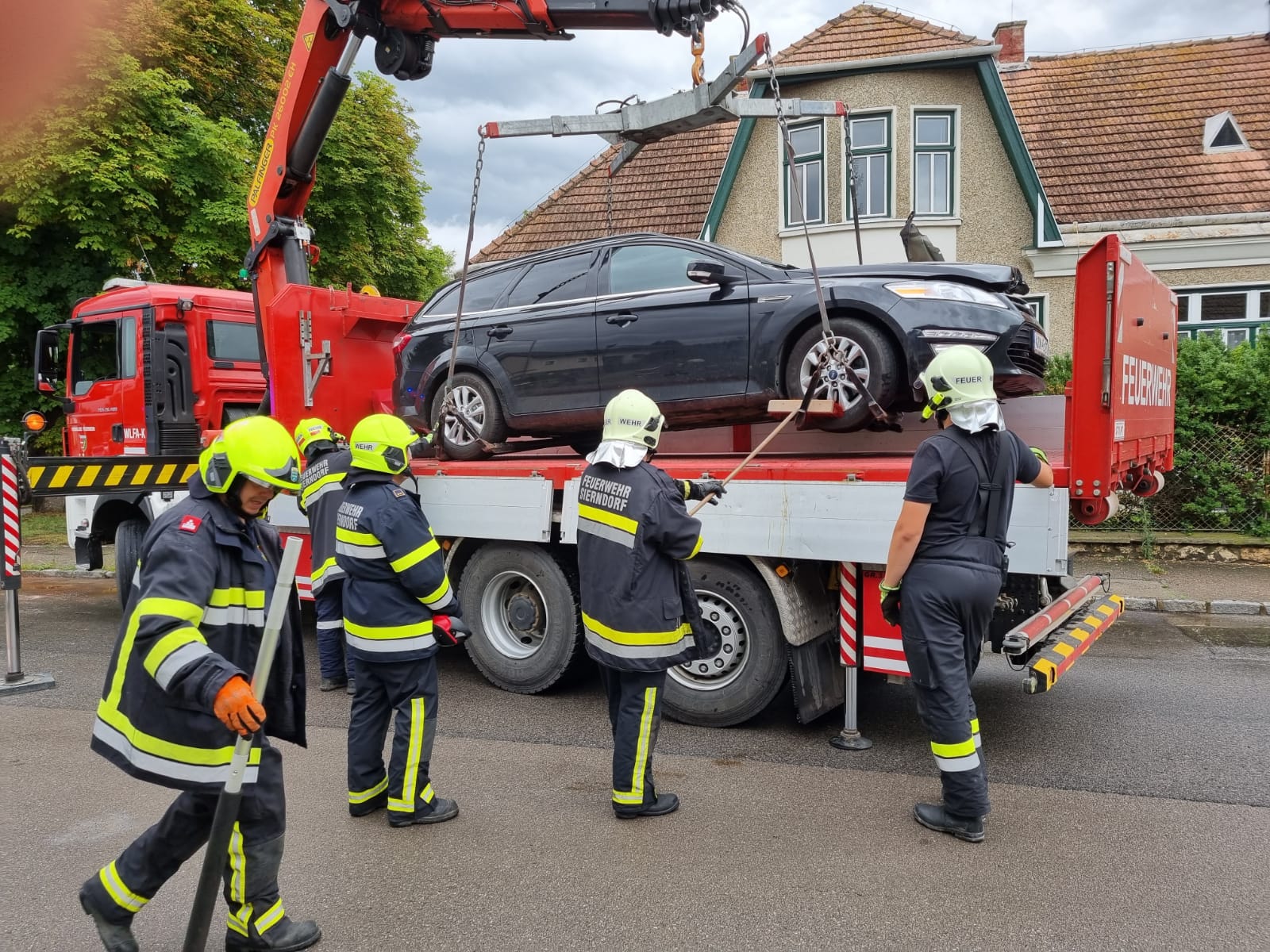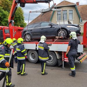 Von uns wurde der Motorraum mit hydraulischem Rettungsgerät geöffnet um die Batterie abklemmen zu können. Im Anschluss wurden ausgetretene Flüssigkeiten gebunden und der PKW mittels WLF-Kran und Hebekreuz verladen und am Bauhof Sierndorf gesichert abgestellt.