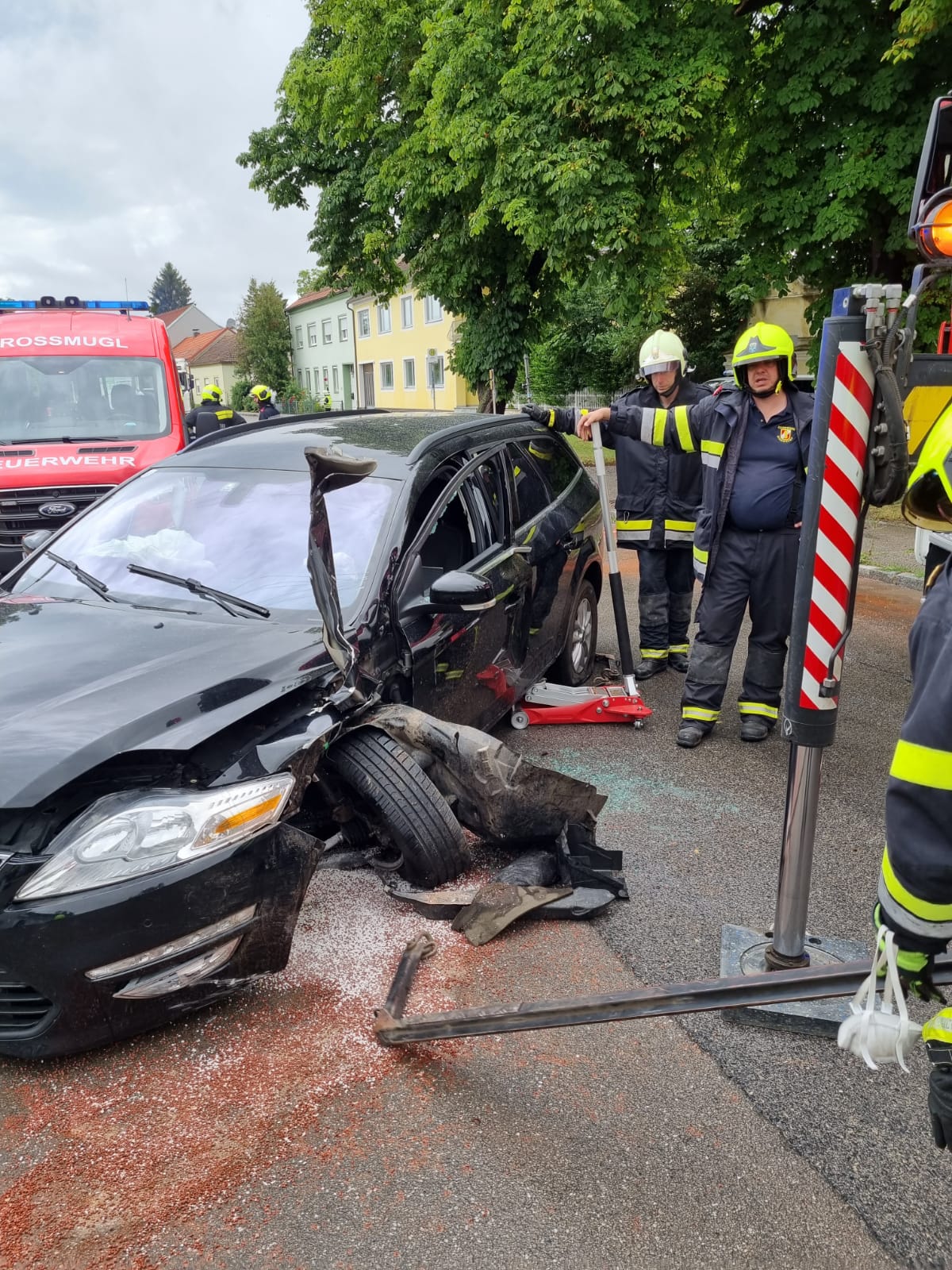 Wir wurden zur Unterstützung der örtlichen Einsatzkräfte zu einem Verkehrsunfall mit einer vermutlich eingeklemmten Person im Ortsgebiet von Großmugl gerufen. Da das RLF Großmugl derzeit nicht einsatzbereit ist (befindet sich beim Service) erfolgte die Alarmierung für uns lt. Alarmplan mittels Sirene, Pager und SMS