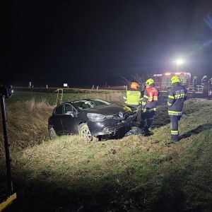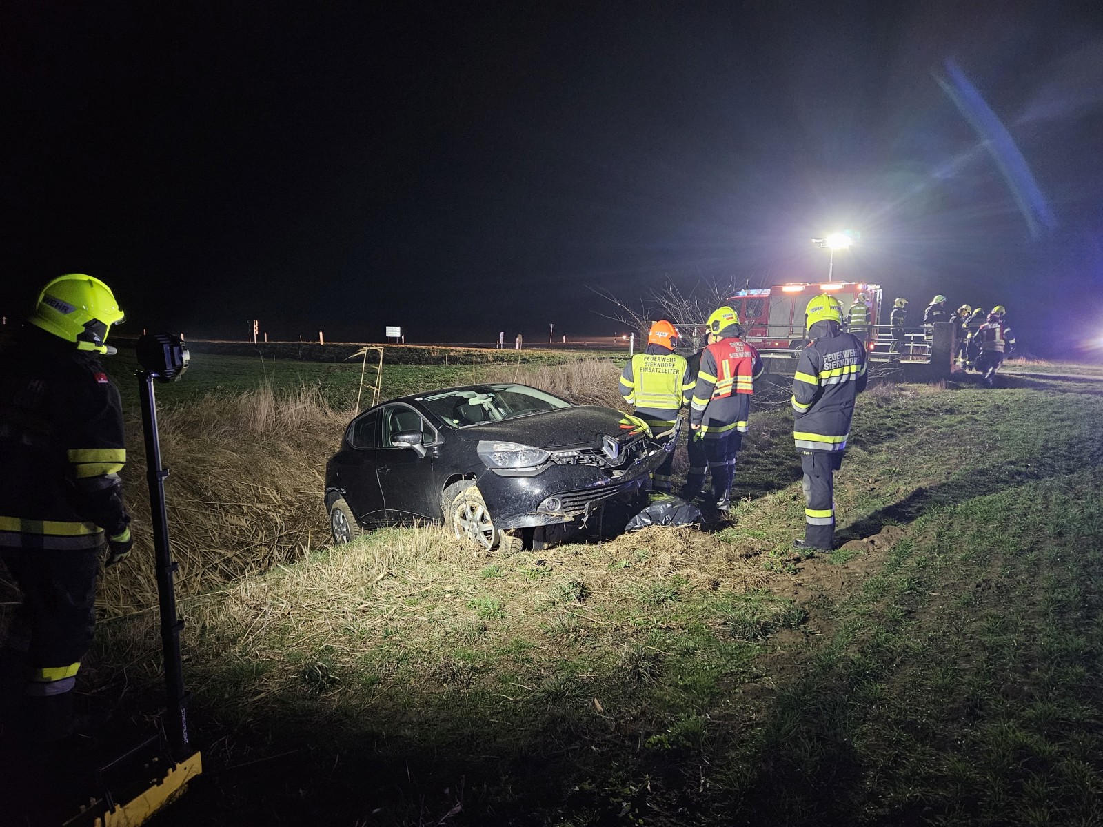 Ein PKW ist aus uns unbekannten Gründen von der Fahrbahn abgekommen und auf der Böschung eines Entwässerungsgrabens zu stehen gekommen. Eine Bergung des Fahrzeugs ohne Kranfahrzeug war nicht möglich.